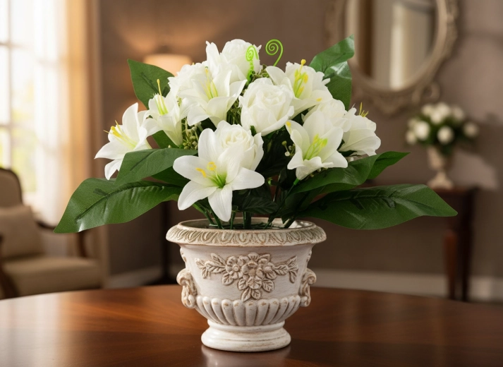 Kies uit een mix van kleuren om eenvoudig af te stemmen op diverse interieurs of seizoensdecoraties. Het arrangement vereist geen water geven of speciale verzorging en behoudt langdurig zijn vorm en kleuren – perfect voor woondecoratie, werkplek, recepties en herdenkingsplaatsen.