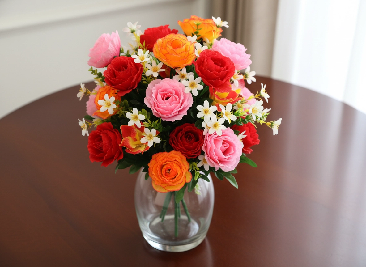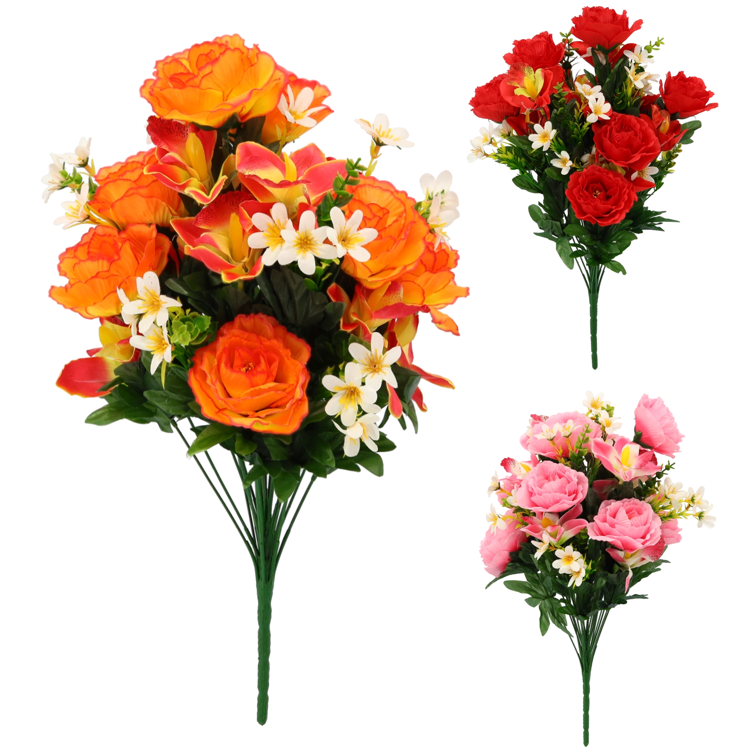 Elegant kunstboeket met een combinatie van rozen, orchideeën en kleine witte bloemetjes in een kleurenmix (rood, roze, oranje). Biedt realistische details, lange levensduur zonder onderhoud en fleurt onmiddellijk zowel interieurs als feestelijke decoraties op.