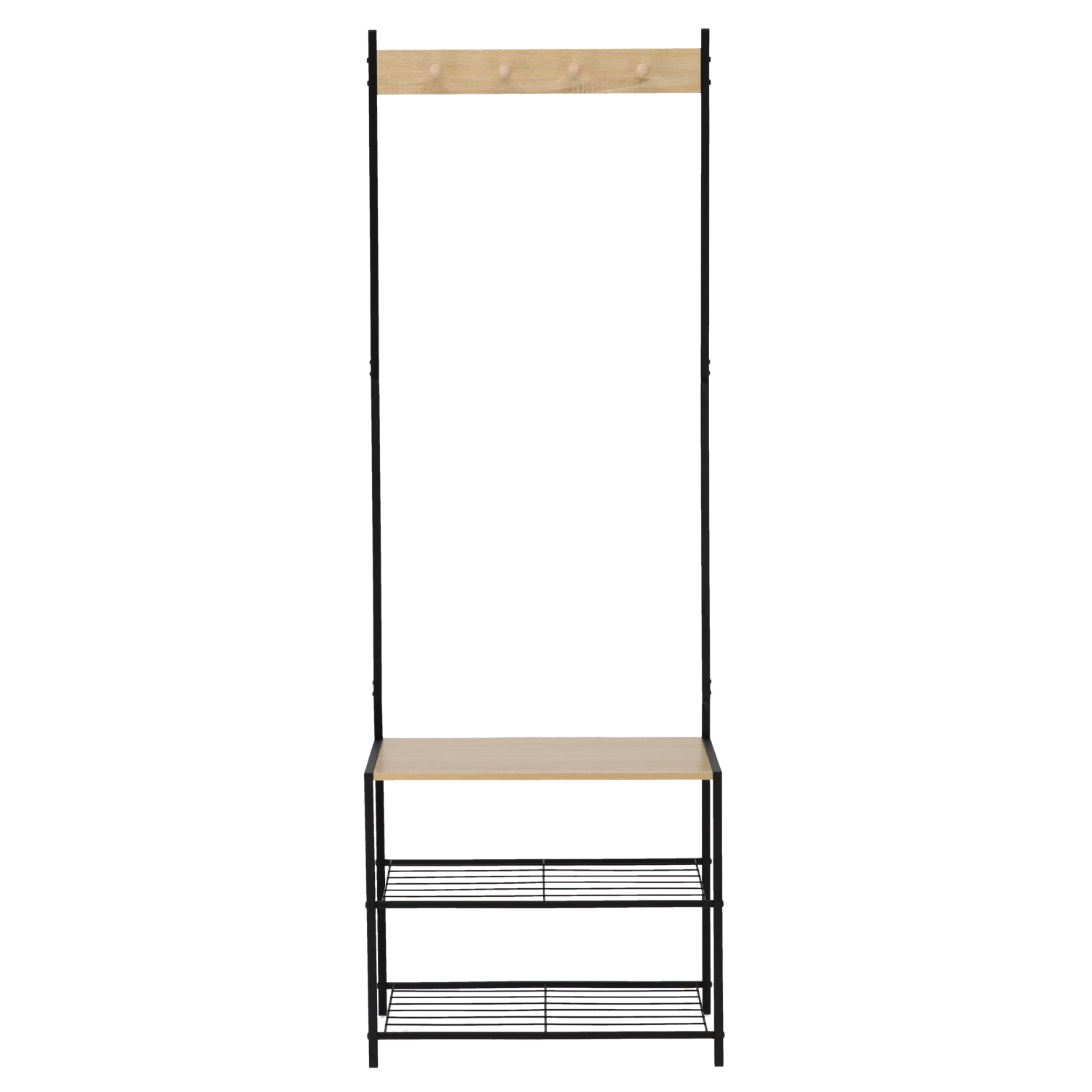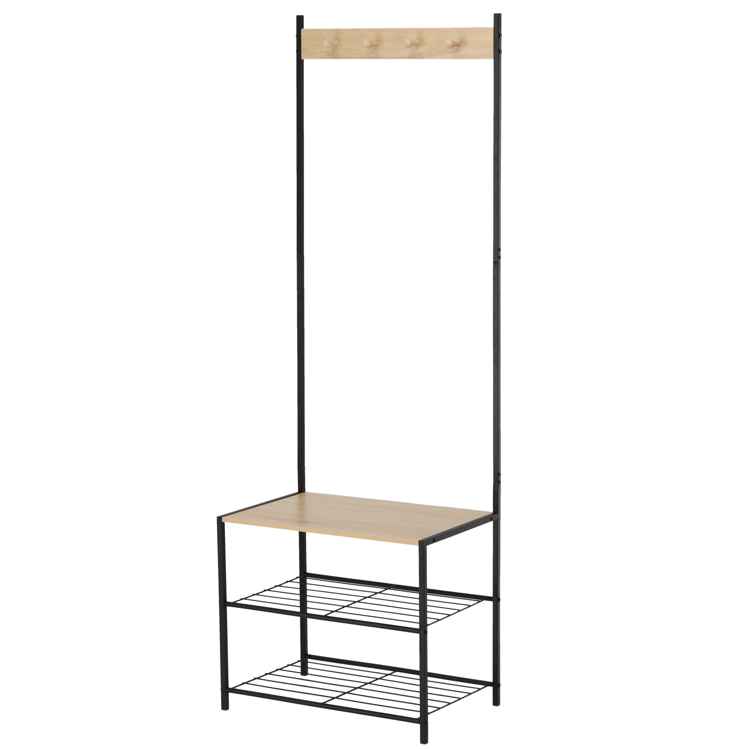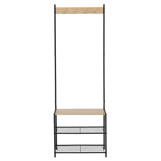 Het robuuste frame van gecoat metaal zorgt voor stabiliteit en een lange levensduur, terwijl houten accenten een warme loftuitstraling geven. Twee onderste metalen planken bieden plaats aan meerdere paar schoenen, terwijl de bovenste rail met haken jacks, sjaals en handtassen overzichtelijk bij elkaar houdt.