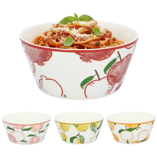 Elegante porseleinen kom met een inhoud van 500 ml, ideaal voor het serveren van soepen, bouillons en andere gerechten. Gemaakt van hoogwaardige keramiek voor lange levensduur en bestendigheid bij dagelijks gebruik. Het gladde oppervlak en de esthetische afwerking geven uw tafel een elegante uitstraling, terwijl het kleurrijke fruitmotief vrolijkheid aan het serveren toevoegt. Vaatwasmachinebestendig voor eenvoudig onderhoud.