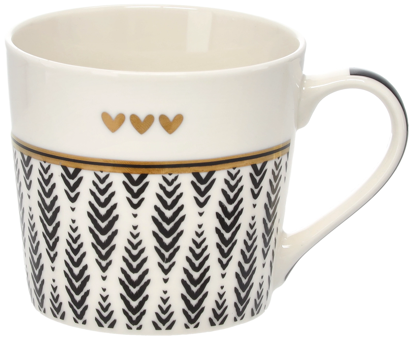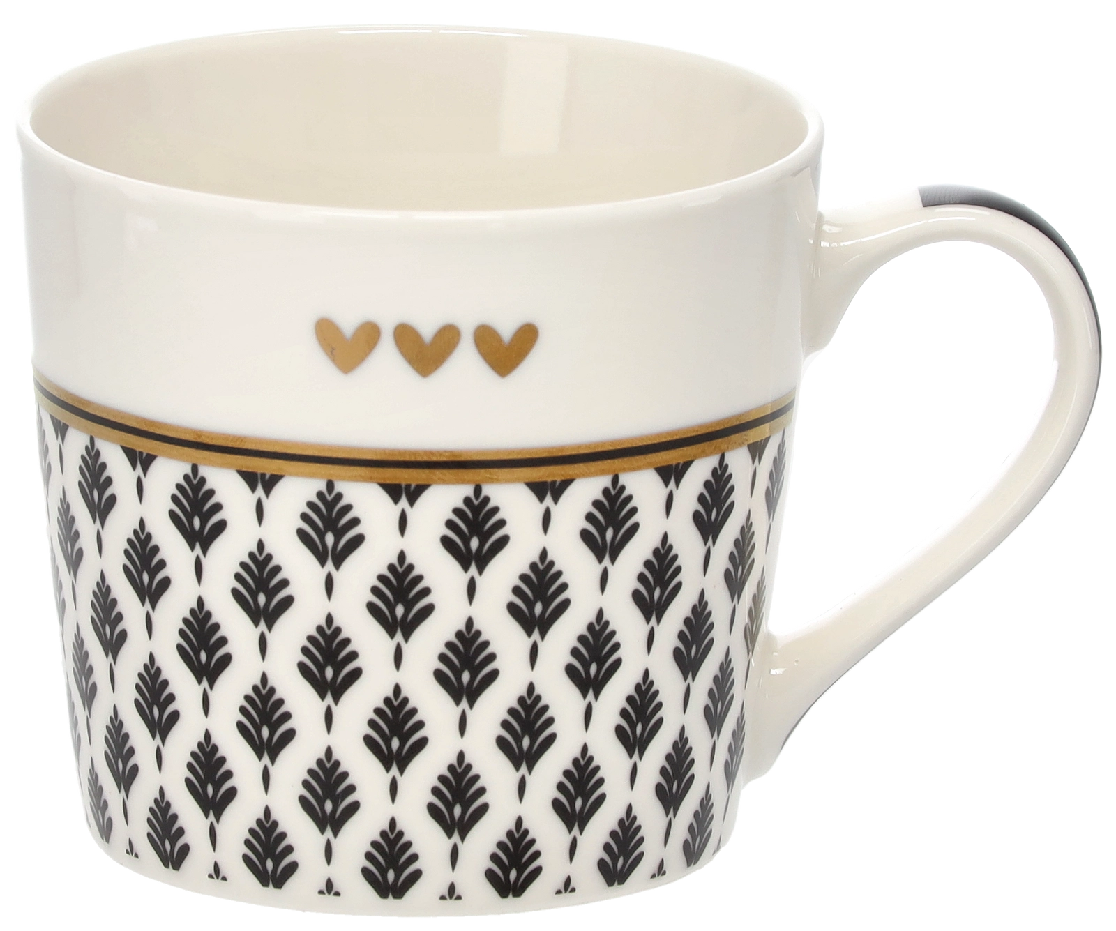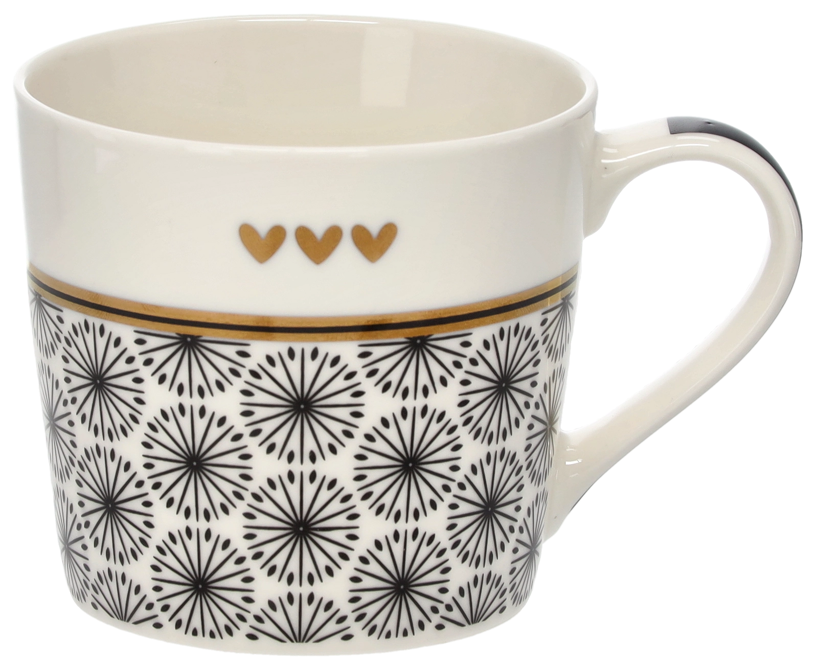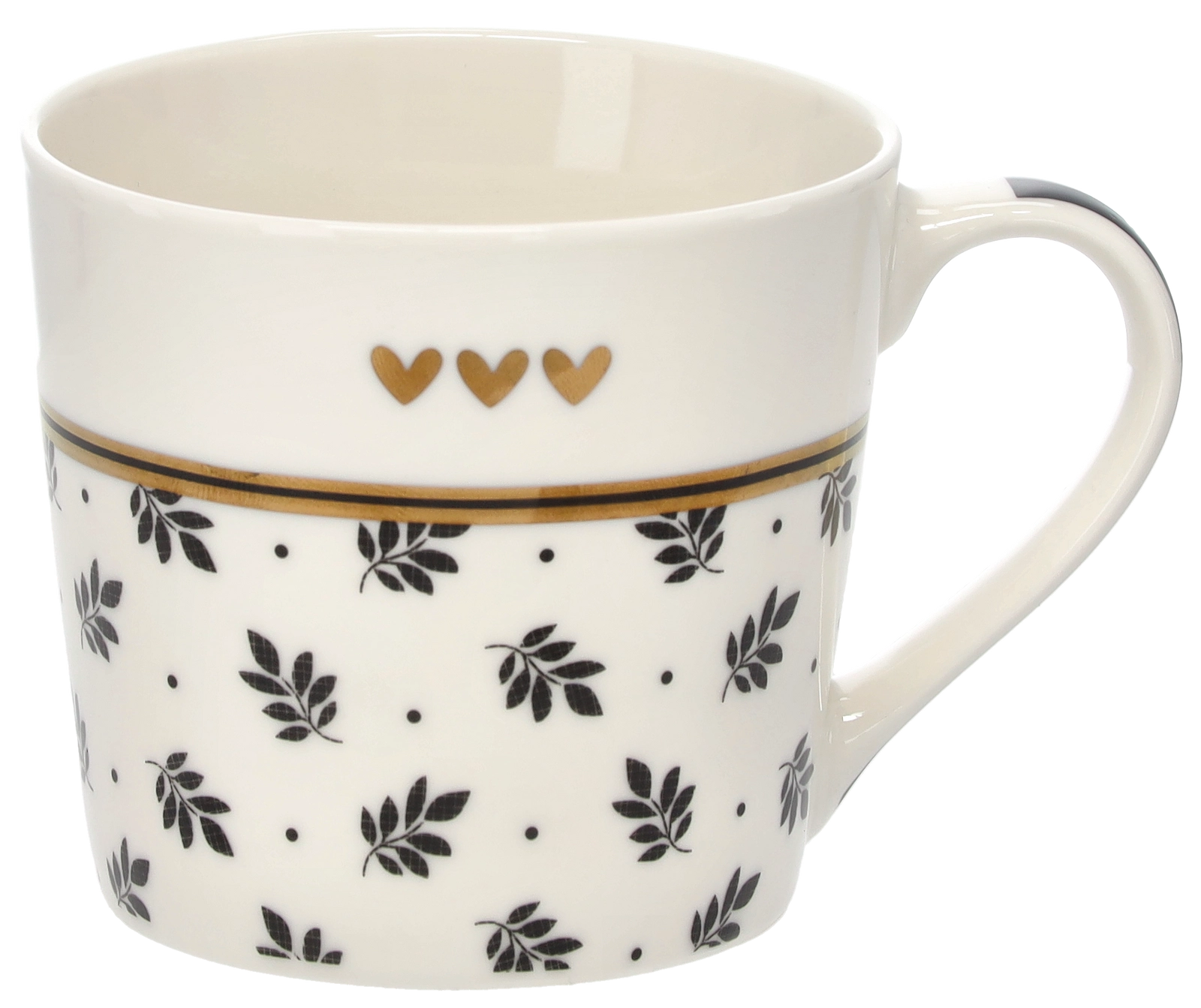 Het verfijnde takjesmotief, aangevuld met drie kleine hartjes en een gouden rand, geeft de mok een sophisticated uitstraling die op elke tafel opvalt.