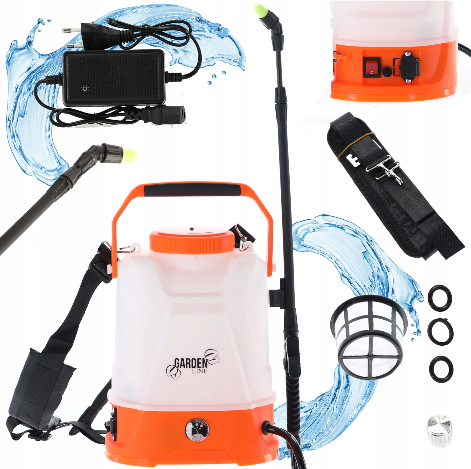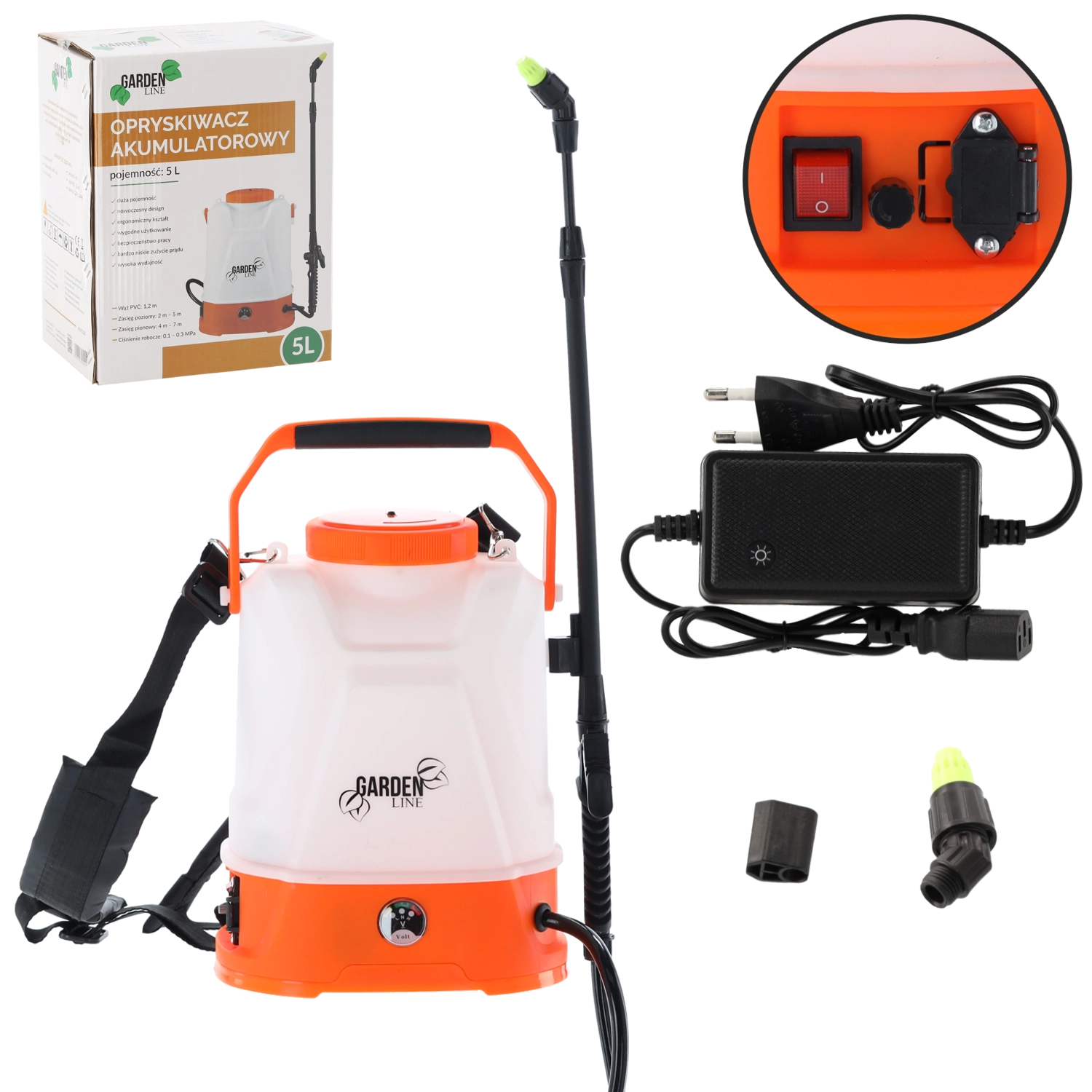 De uitrusting omvat een verstelbare sproeikop voor fijne nevel of een continue straal, een lans van 65 cm met adapter, een slang van 120 cm voor vrije beweging, een filter en een set dichtingen. Een afgedekte oplaadpoort beschermt de elektronica en verlengt de levensduur van het apparaat. De sproeireikwijdte is tot 5 m horizontaal en tot 7 m verticaal.