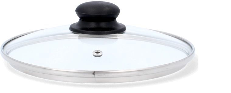 Universeel glazen deksel met een diameter van 20 cm, gemaakt van duurzaam gehard glas, ideaal voor dagelijks koken. Biedt hittebestendigheid, een praktisch stoomventiel voor het afvoeren van overtollige stoom en een stevige kunststof knop voor veilige hantering. De roestvrijstalen binnenrand voorkomt dat gecondenseerde stoom langs de pan naar buiten druipt.