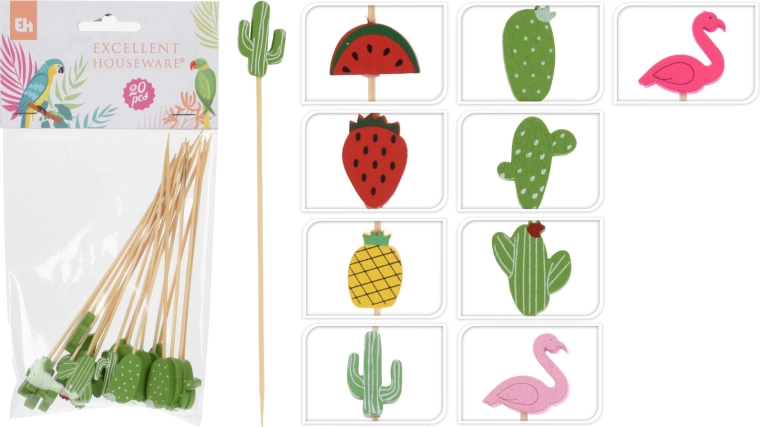 Stijlvolle decoratieve prikkers van 12 cm van natuurlijk bamboe geven je gerechten en drankjes een vrolijke, kleurrijke touch. In de verpakking vind je 20 stevige en milieuvriendelijke prikkers met verschillende versieringen, ideaal voor cocktails, desserts, tapas en hapjes.
