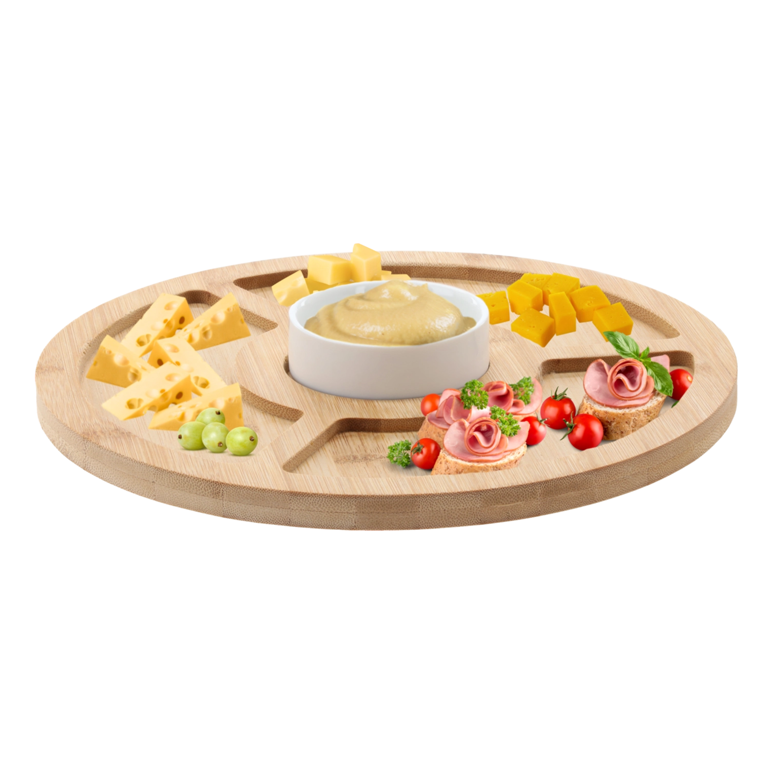De gesegmenteerde vakken houden kazen, vleeswaren, fruit en noten duidelijk gescheiden, zodat alles er aantrekkelijk uitziet en vers blijft.