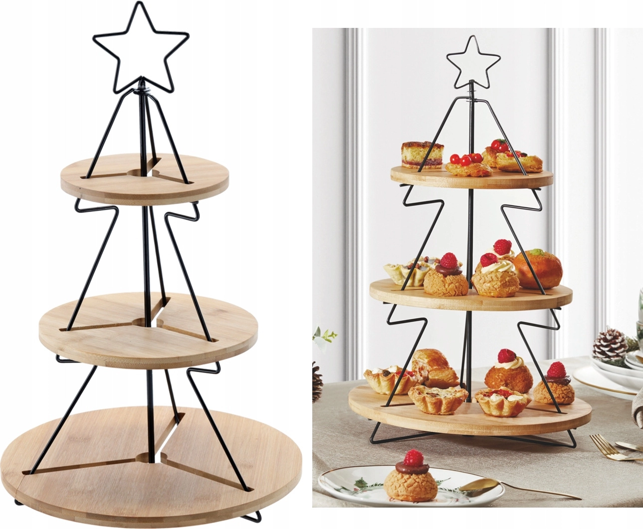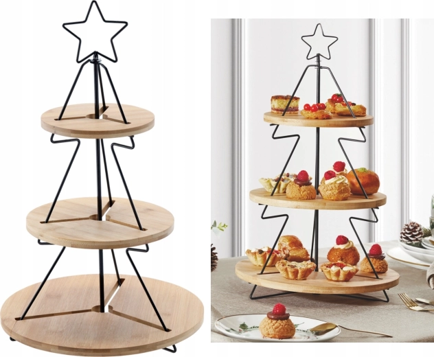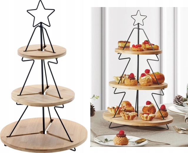 Elegante driedelige etagère in de vorm van een kerstboom die natuurlijk bamboe en duurzaam metaal combineert voor stijlvol serveren van desserts, snacks en fruit. De drie niveaus besparen ruimte op tafel, terwijl de stabiele constructie en het tijdloze design elke feestelijke tafel een bijzondere sfeer geven.