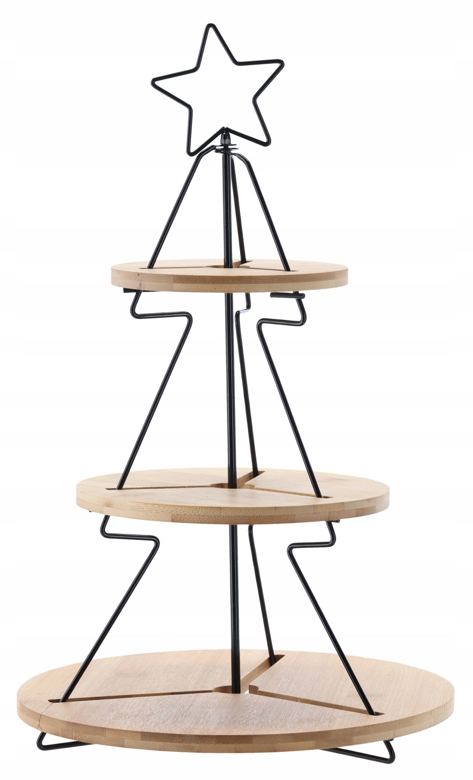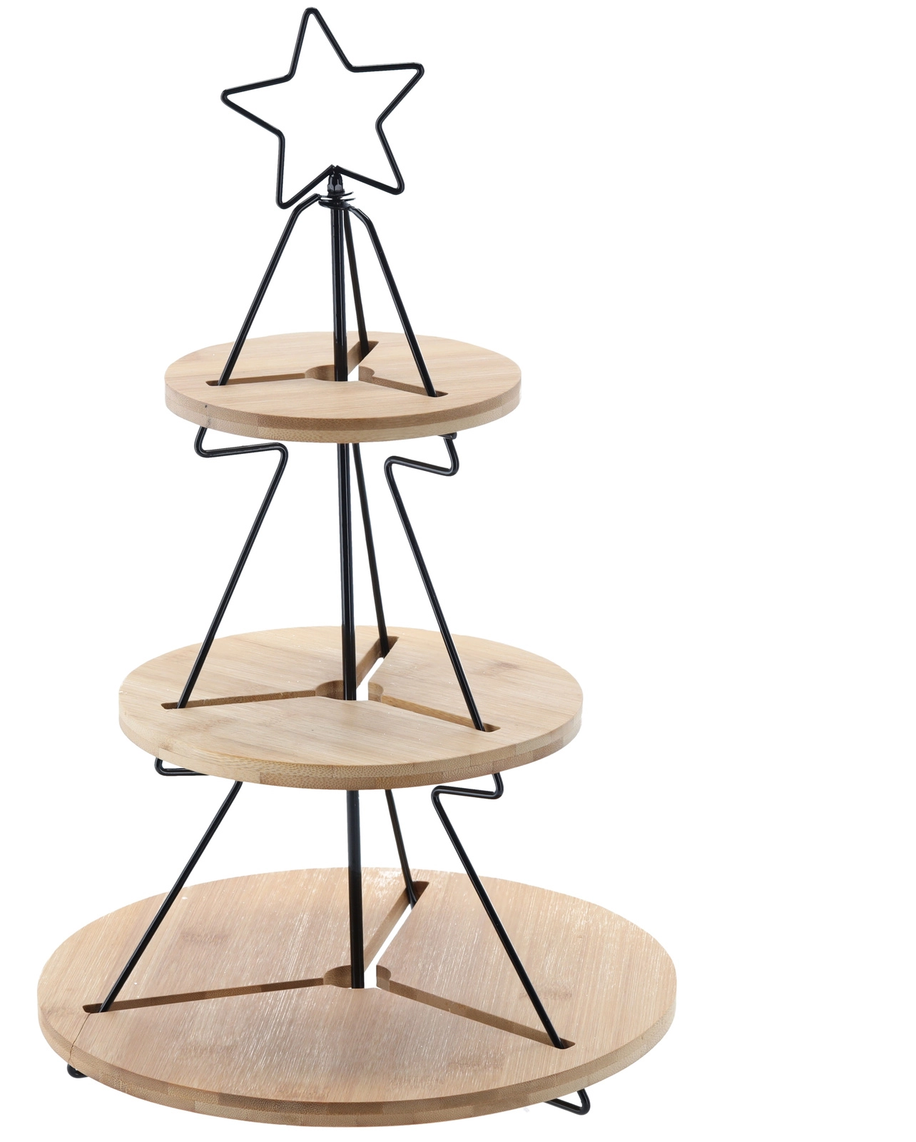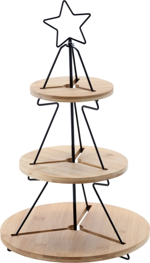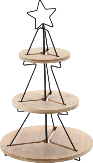 Deze decoratieve én praktische driedelige etagère is ideaal voor het serveren van koekjes, belegde broodjes, fruit of cupcakes. Het minimalistische metalen frame in boomvorm met ster en de ronde bamboe schalen creëren direct feestelijke magie op elke tafel – van familiediner tot feestelijk buffet.