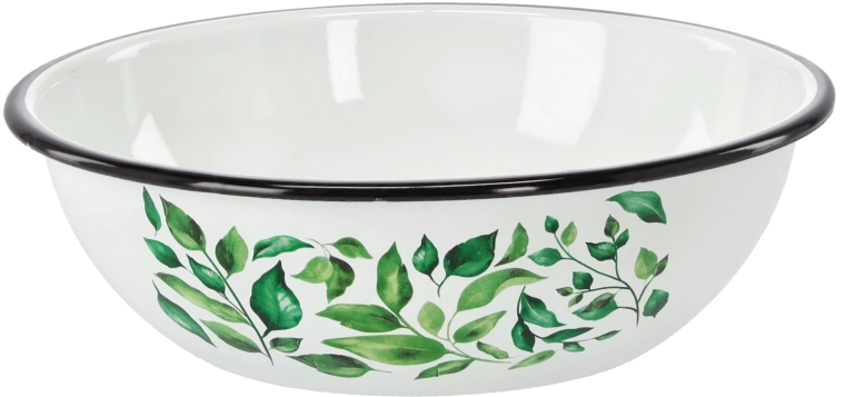 Praktische en elegante geëmailleerde kom met een inhoud van 2,5 l en een diameter van 24,5 cm in het wit met ficusmotief. Ideaal voor dagelijks gebruik – van het mengen van beslag tot het serveren van salades. Duurzaam geëmailleerd oppervlak is hygiënisch, gemakkelijk te reinigen en beïnvloedt de smaak noch de geur van voedingsmiddelen. Dankzij de bestendigheid tegen hoge en lage temperaturen biedt het een brede inzetbaarheid in elke keuken.