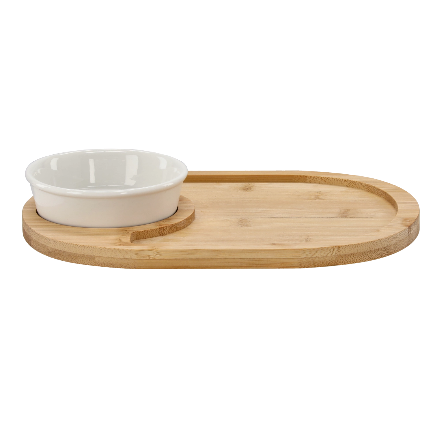 Deze veelzijdige set voor het serveren van voorgerechten valt op door de moderne natuurlijke uitstraling en het functionele design. De ovale bamboeschaal met een gereserveerde plek voor het porseleinen schaaltje maakt het mogelijk om kazen, vleeswaren, olijven of brood overzichtelijk te rangschikken en tegelijk sauzen, dips of pesto te serveren. Dankzij de afmetingen 28 × 21 × 4 cm is er volop ruimte voor diverse hapjes.
