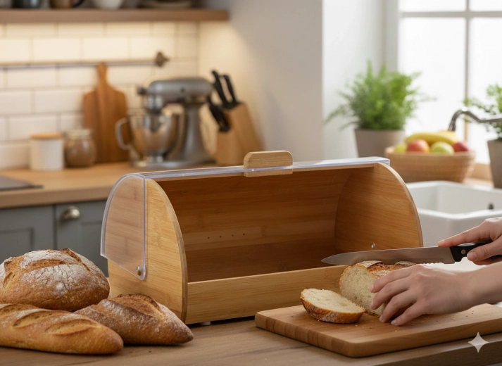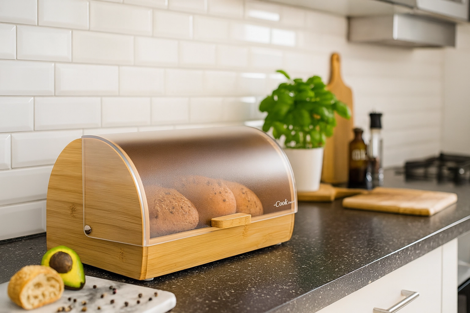 Het halfdoorzichtige deksel beschermt brood en gebak tegen uitdroging en stof, en maakt het tegelijk mogelijk de inhoud snel te controleren zonder te openen.
