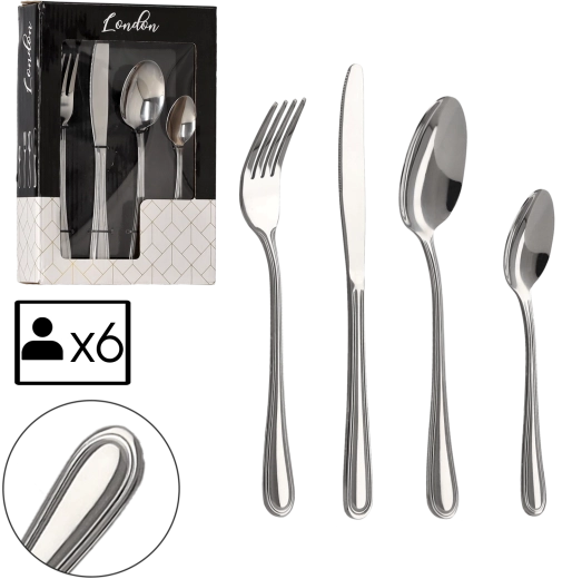 De elegante bestekset London biedt 24 delen voor dagelijks dineren en feestelijke gelegenheden. In de verpakking vind je 6 messen, 6 vorken, 6 soeplepels en 6 theelepels. Het tijdloze, klassieke design combineert eenvoud, elegantie en hoogwaardige afwerking van duurzaam roestvrij staal.