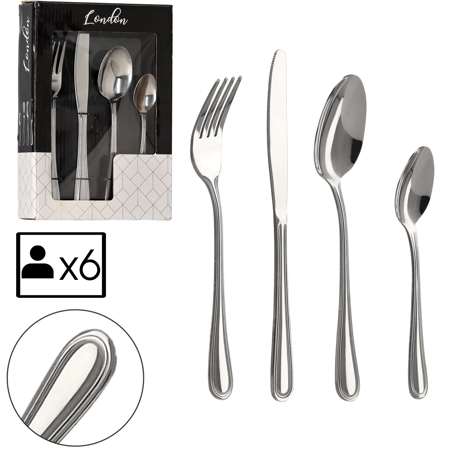 In de verpakking zitten 24 delen: 6 messen, 6 vorken, 6 soeplepels en 6 theelepels – klaar voor dagelijks gebruik en bezoek.