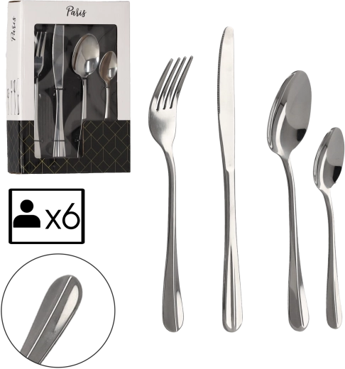 De set van 24 stuks bevat alles wat u nodig heeft: messen, vorken, soeplepels en theelepels.