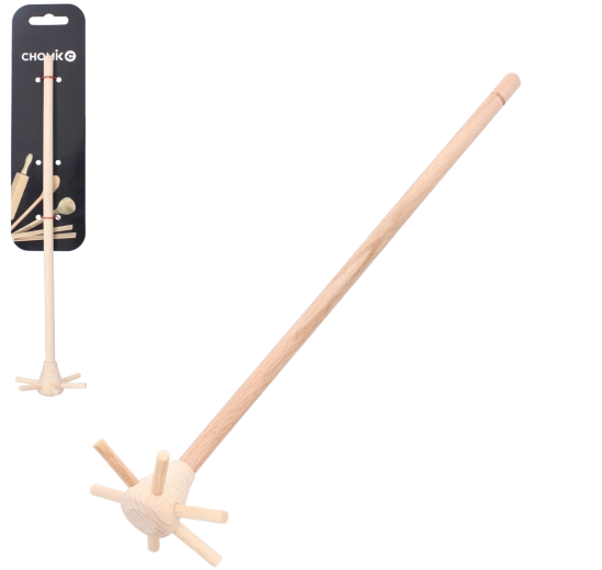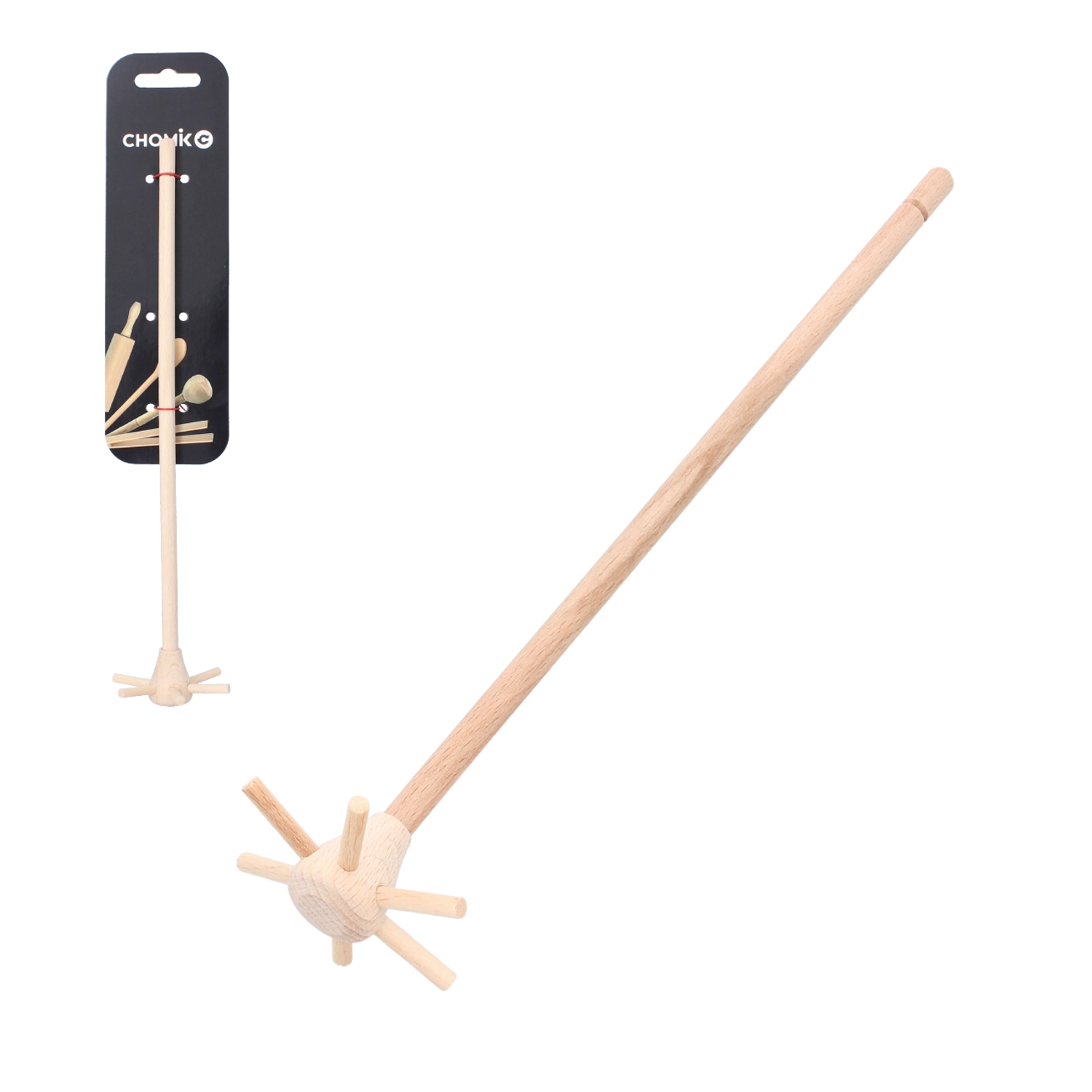 Universele houten garde met een klassieke vorm die moeiteloos sauzen, crèmes en soepen mengt. Dankzij de lengte van 27 cm bereik je comfortabel de bodem van de pan en blijft het oppervlak ongeschonden – krast geen antiaanbak- of geëmailleerde pannen.