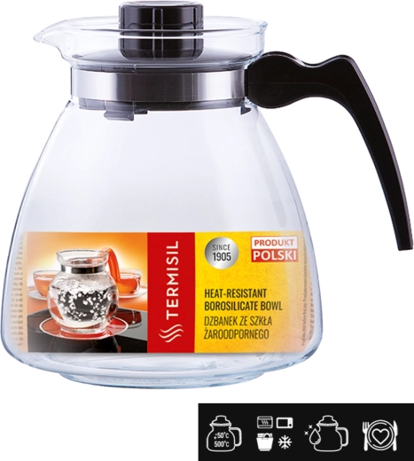 Elegante en lichte kan TERMISIL Ewa met een inhoud van 2,1 l van hoogwaardig borosilicaatglas, ideaal voor dagelijks gebruik. Bestand tegen temperaturen van -50 °C tot +500 °C, dus geschikt voor in de koelkast en vriezer en te gebruiken op elektrische kookplaten. Het materiaal is chemisch inert, beïnvloedt de smaak of geur van dranken niet, is krasbestendig en vaatwasmachinebestendig.
