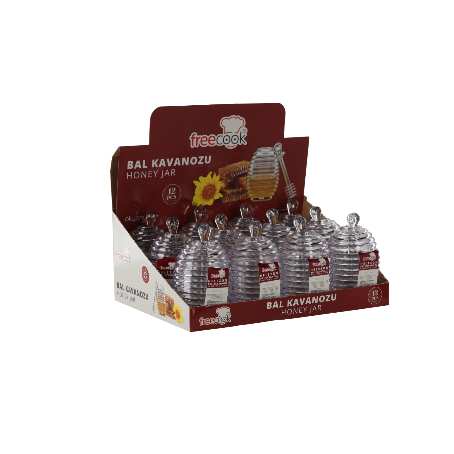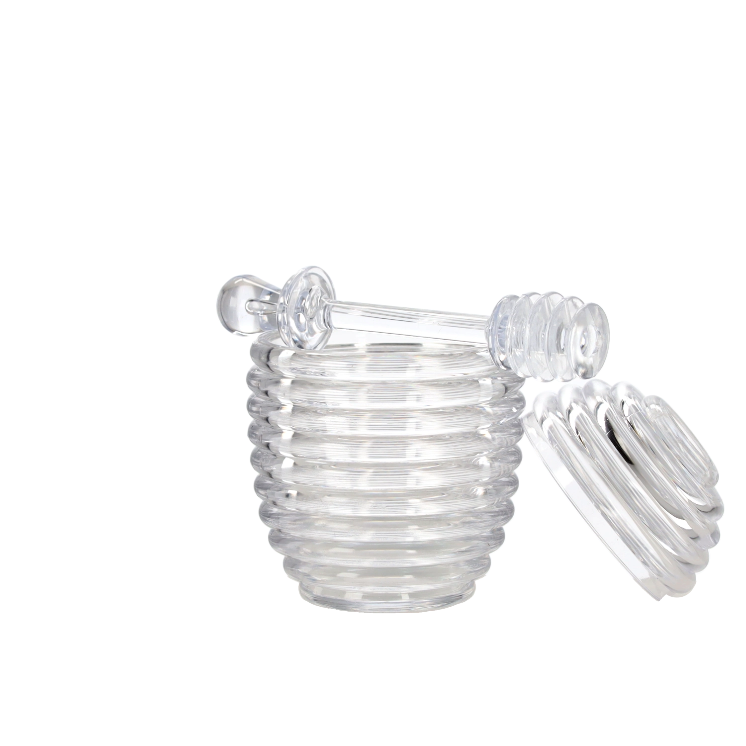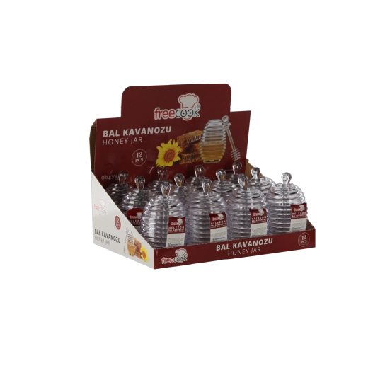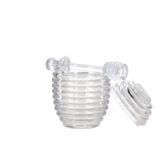 Praktische plastic honingpot met een inhoud van 200 ml, geleverd met een geïntegreerd lepeltje voor eenvoudig doseren. Dankzij het reliëfoppervlak in de vorm van een bijenkorf oogt hij esthetisch en past hij perfect in elke keuken. Ideaal voor comfortabele dosering en hygiënische opslag van honing.