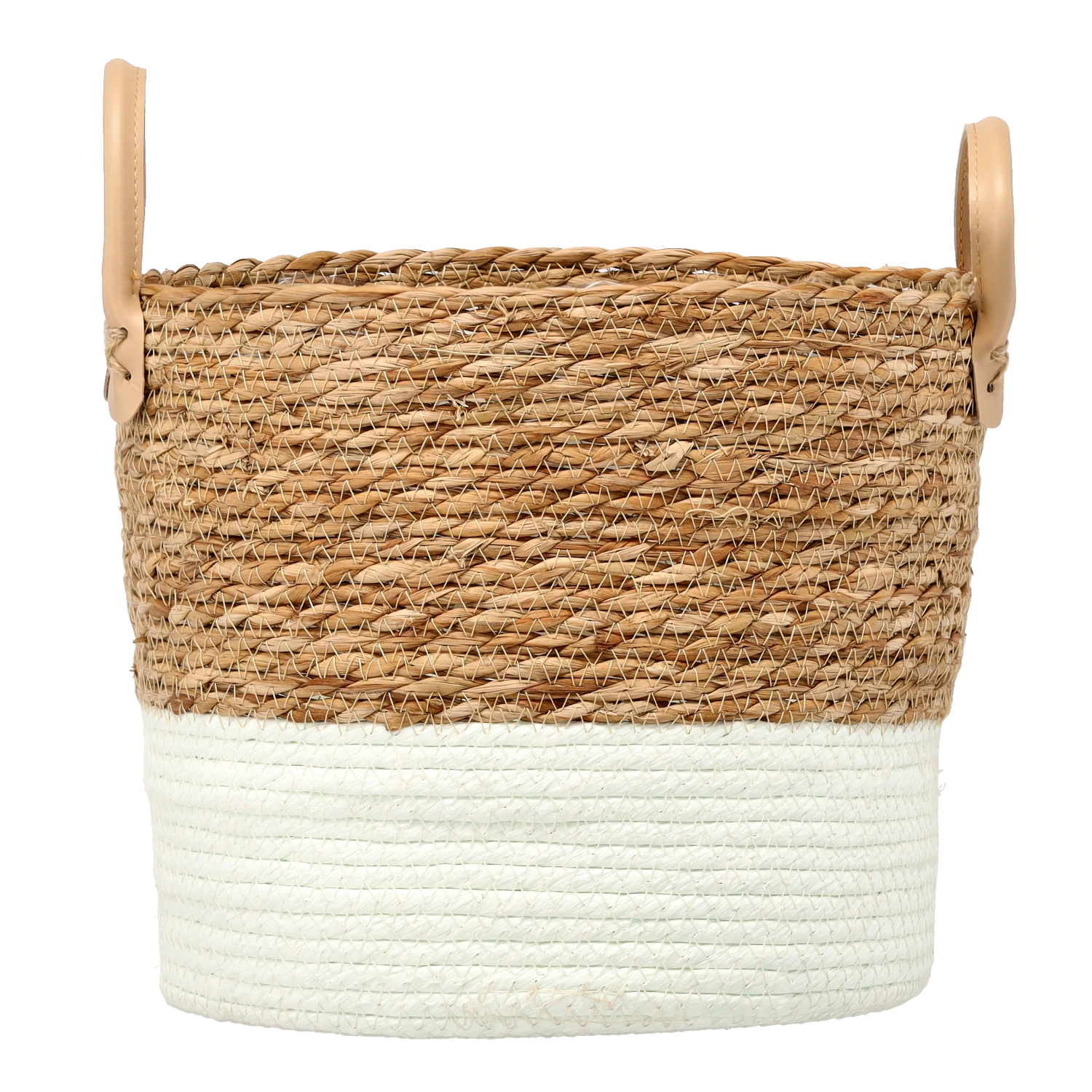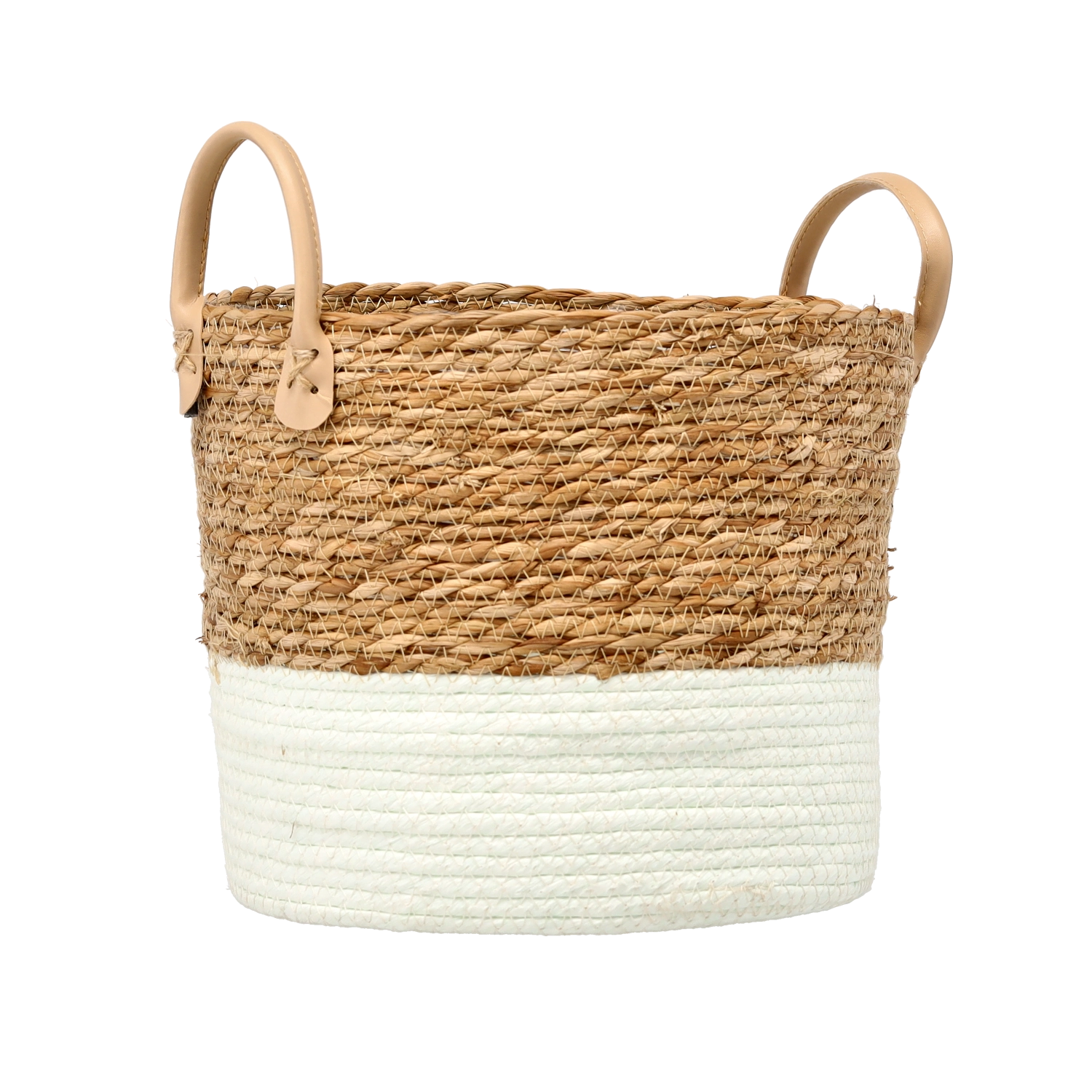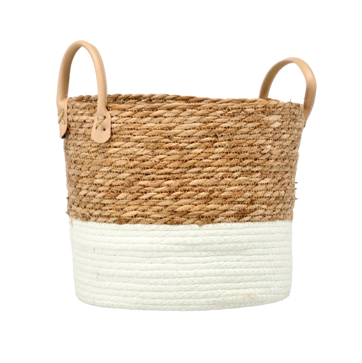 De mand is gemaakt van zeegras en zorgvuldig met de hand gevlochten, waardoor elk stuk uniek is en bestand tegen dagelijks gebruik.