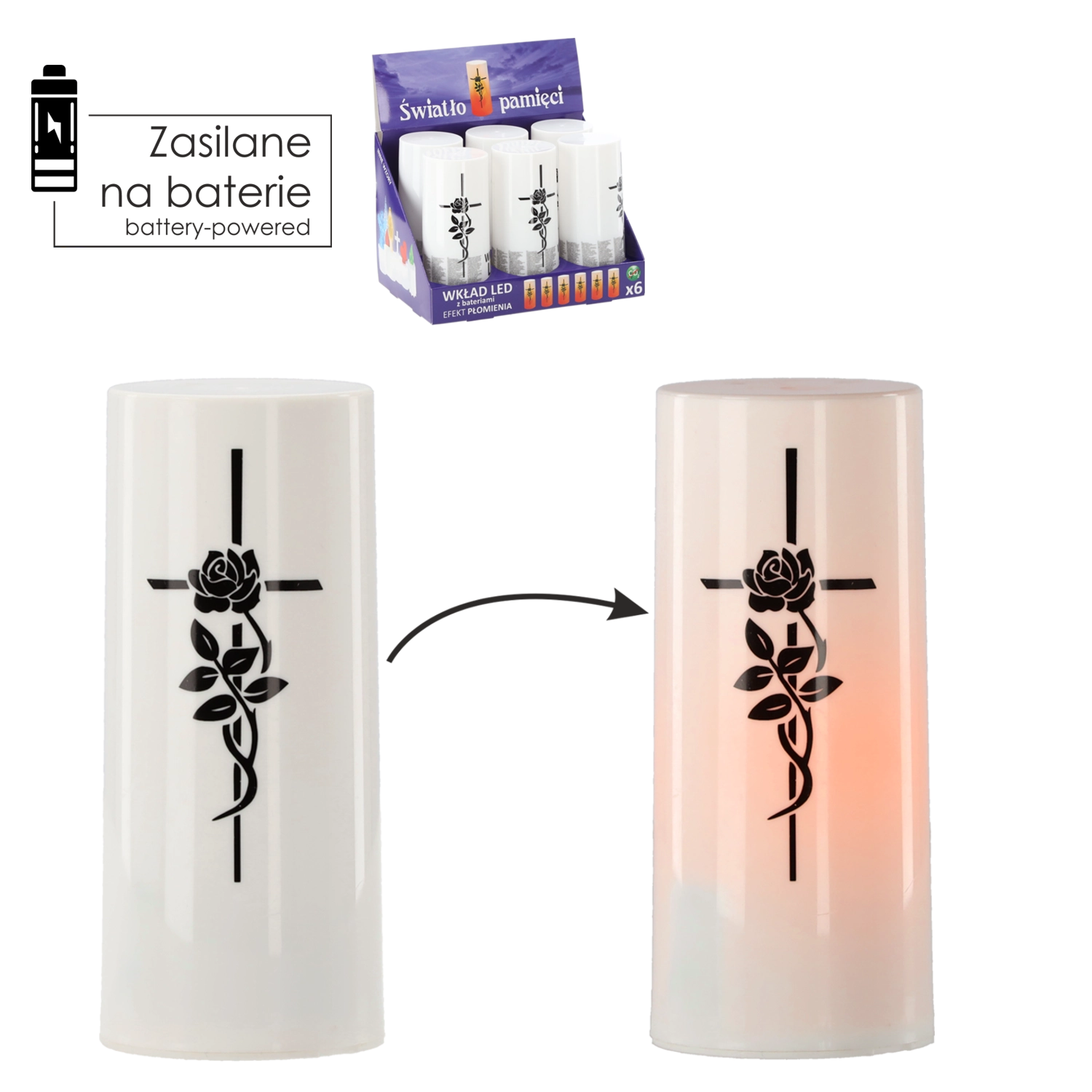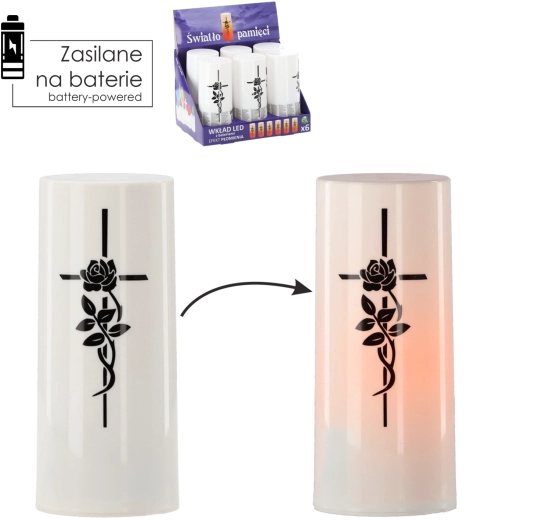 De LED-inzet voor lantaarn met het effect van een levende vlam en een subtiel kruis is een elegante en milieuvriendelijke vervanging voor paraffine- of olielichtjes. Het warmwitte licht imiteert realistisch het flikkerende vuur dat rust en piëteit oproept, zonder rook of roet. Door de werking op batterijen is hij ideaal voor graflantaarns, huiselijke lampionnen en interieurdecoratie.