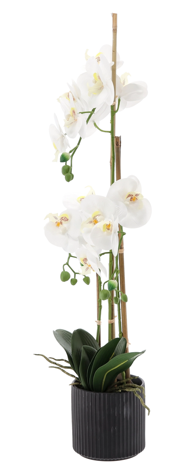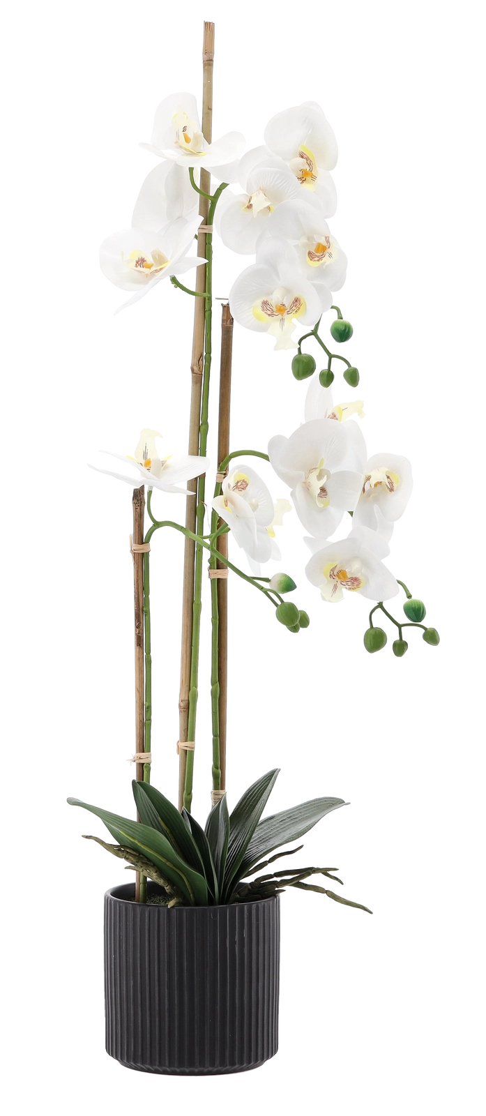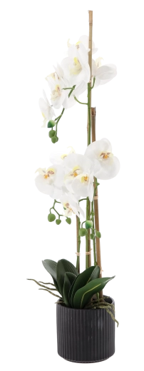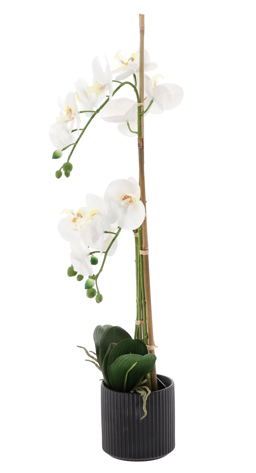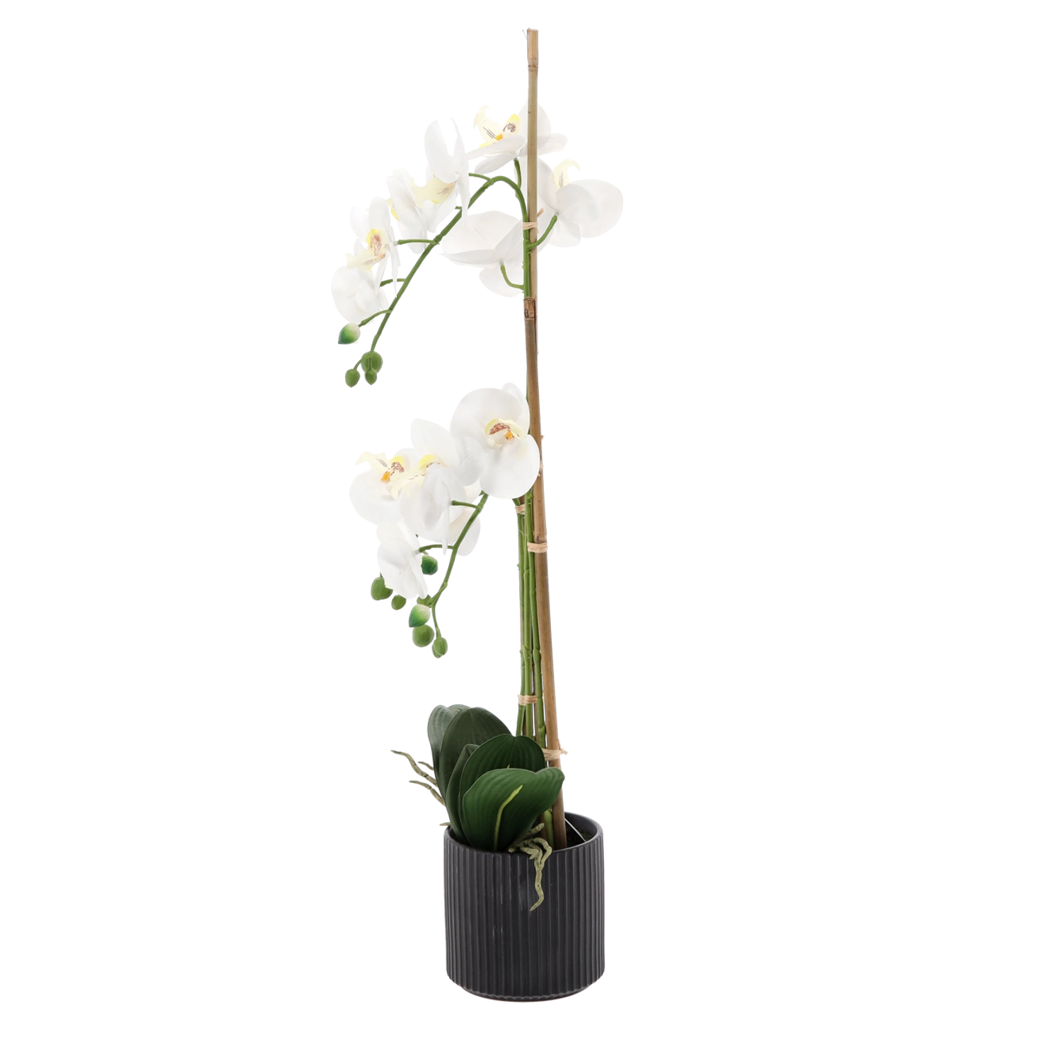 Deze design kunstorchidee is 77 cm hoog en geplaatst in een subtiele zwarte geribbelde bloempot die haar elegante uitstraling benadrukt. Dankzij de natuurgetrouwe afwerking van de bloemen, knoppen en glanzende bladeren brengt zij een natuurlijke sfeer in de ruimte zonder onderhoud.