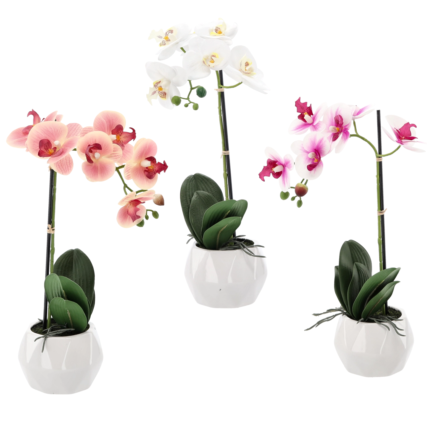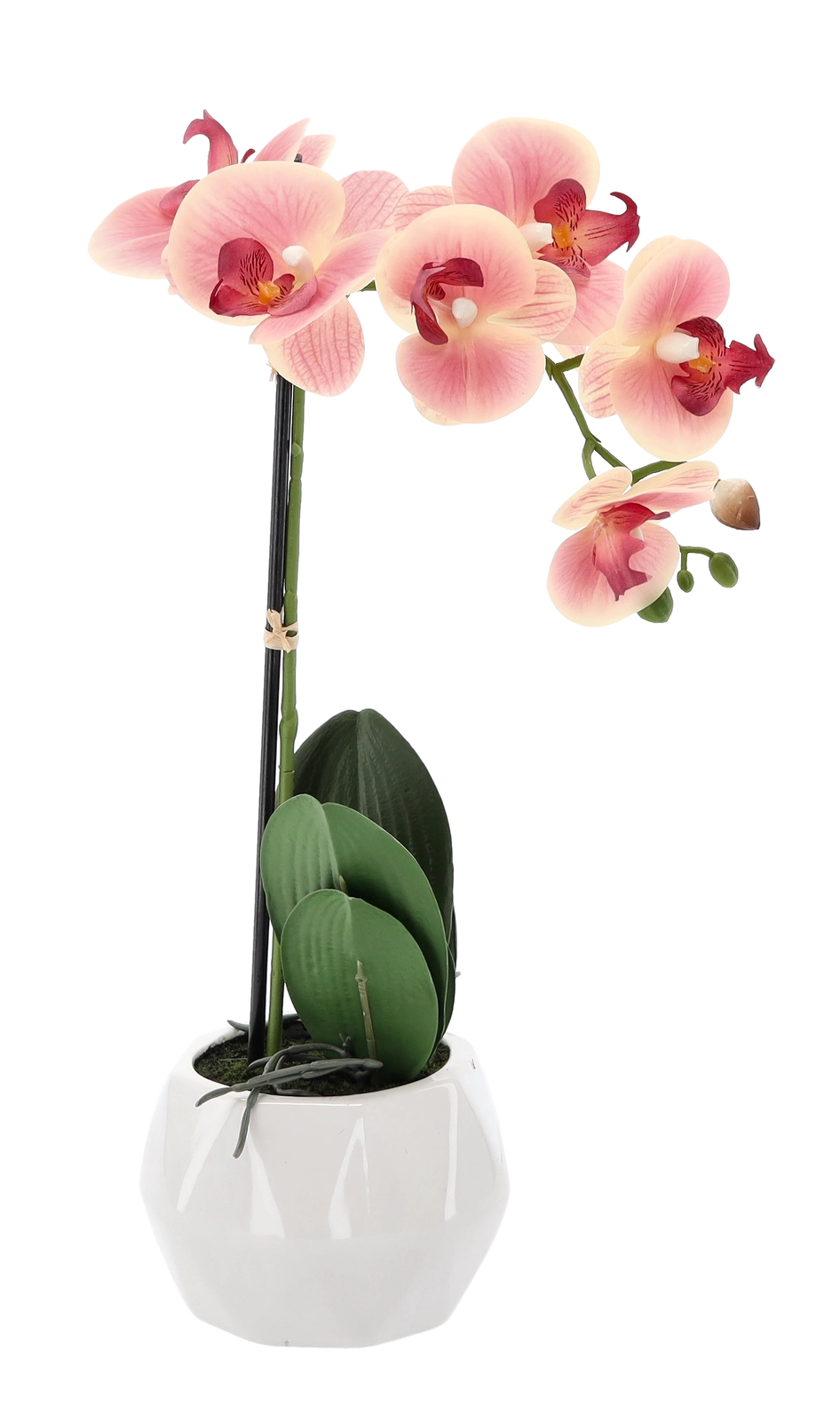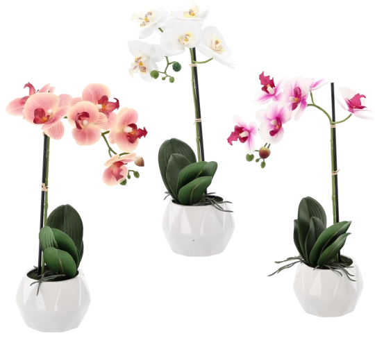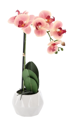 Elegante kunstorchidee met een hoogte van 42 cm in een mix van 3 kleuren (wit, roze, abrikoos) die elk interieur compleet maakt zonder zorgen over onderhoud. Inclusief een stijlvolle witte bloempot en realistische afwerking van bloemen en bladeren voor een natuurlijke uitstraling het hele jaar door.