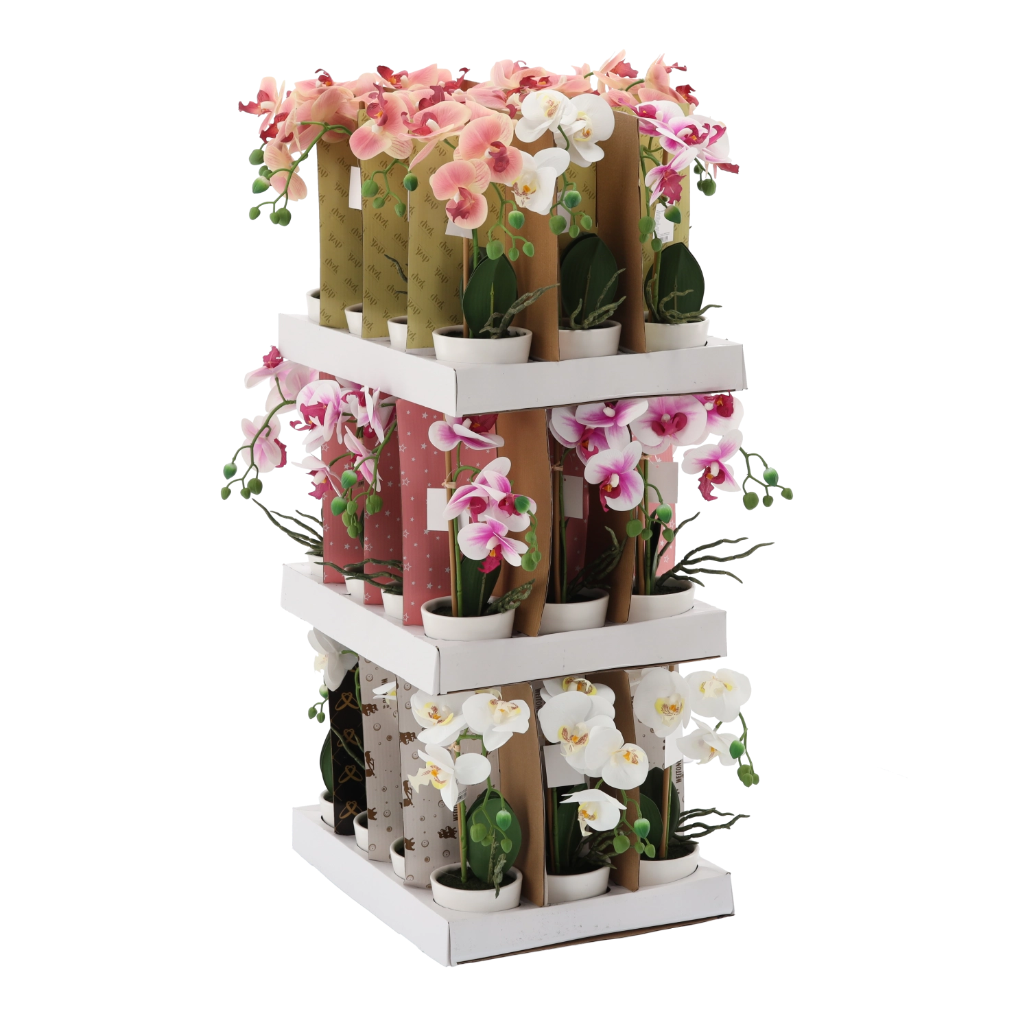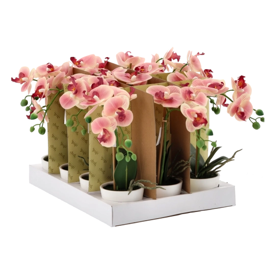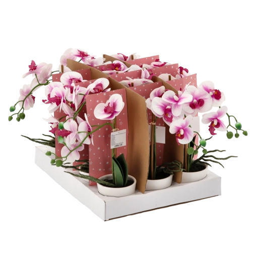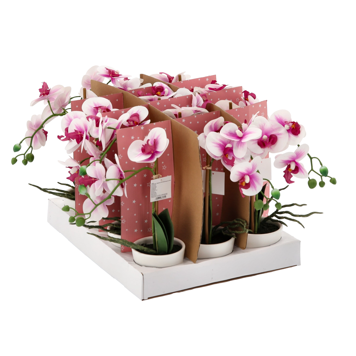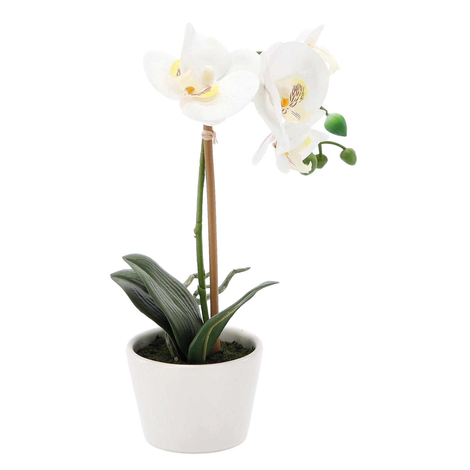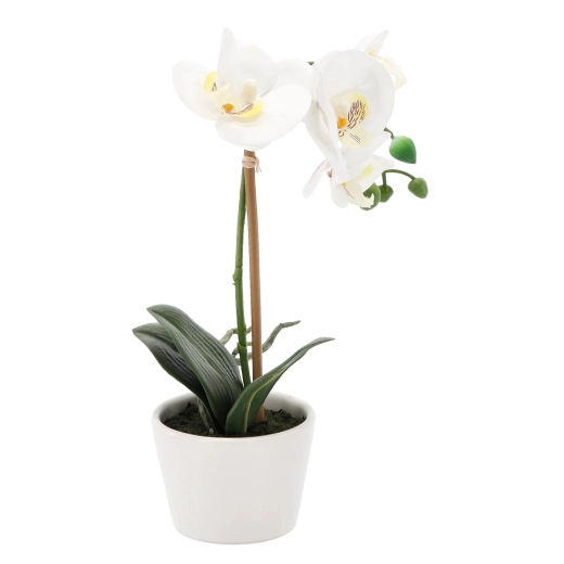 Deze kunstorchidee in pot brengt de elegantie van echte bloemen zonder het gedoe van verzorging. Realistische bloemen, knoppen en bladeren ogen natuurlijk en geven elke kamer een subtiele kleur en harmonie. Dankzij het compacte formaat van 30 cm past hij op tafel, plank of vensterbank.