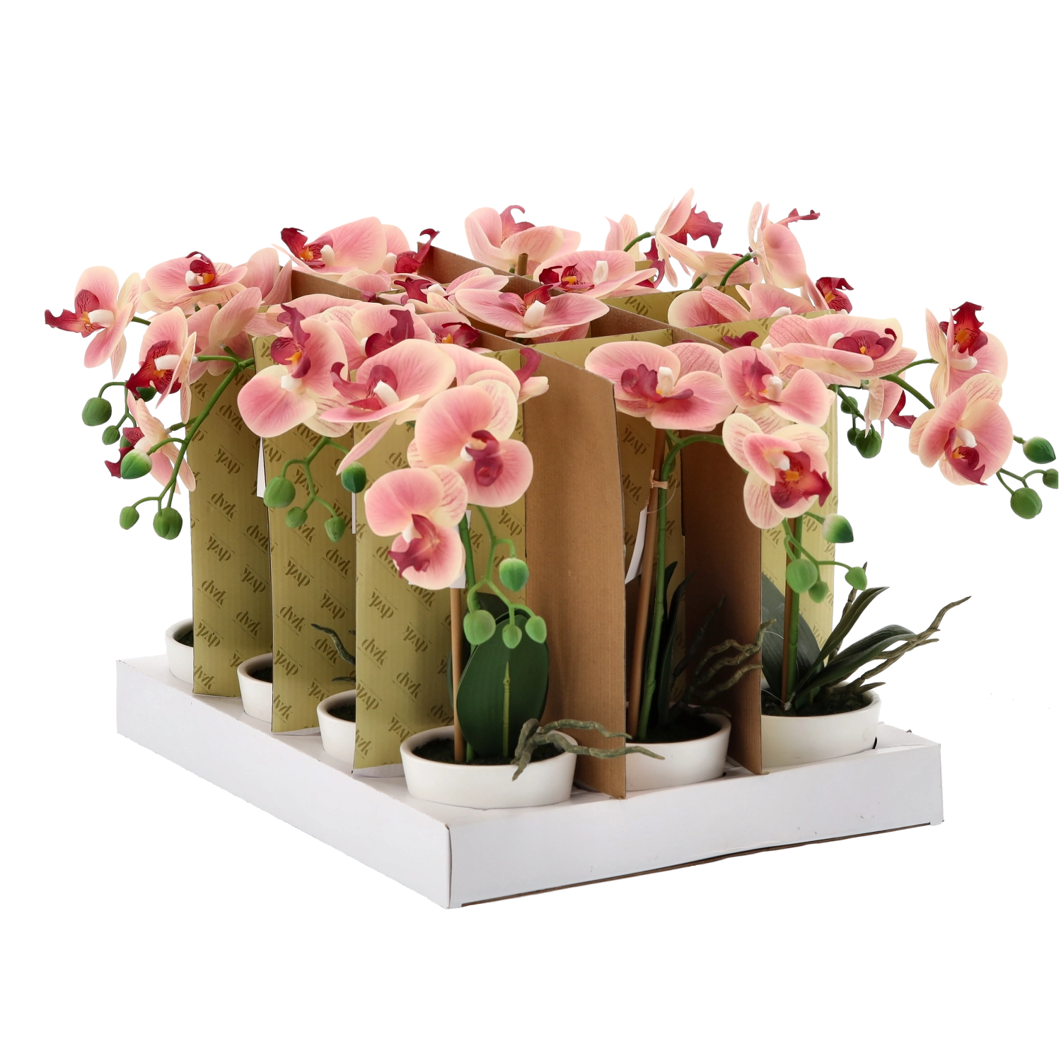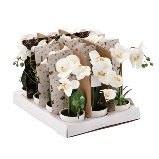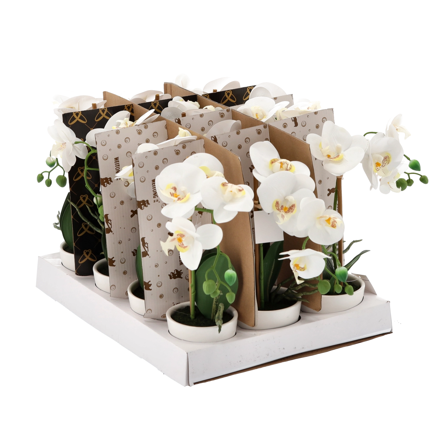 Gedetailleerde bloemen, knoppen en bladeren zorgen voor een natuurlijke look van de orchidee, die het hele jaar mooi blijft zonder water geven of speciale verzorging.