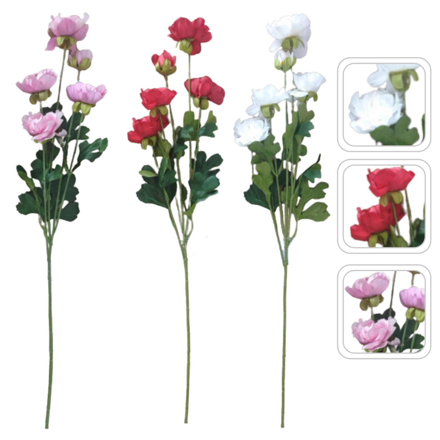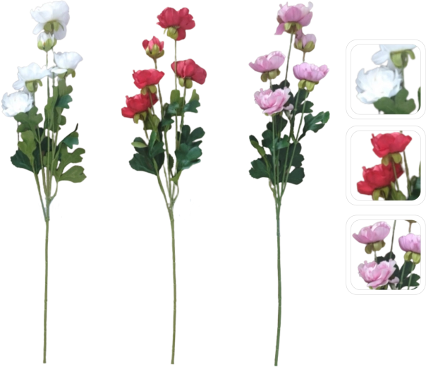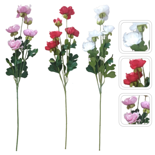 De kunstmatige ranonkel-tak is de ideale keuze voor wie langdurige schoonheid zonder onderhoud wil. De realistische uitvoering van bloemen en bladeren wekt de indruk van vers gesneden groen en geeft je huis, kantoor of event een subtiel natuurlijk accent.