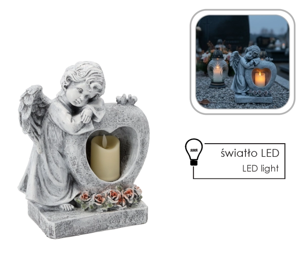 Elegante figuur van een engel leunend tegen een hart met een ingebouwde LED-kaars creëert een warm en serene sfeer in het interieur. De zachte grijze kleur en het fijne vakmanschap met kleine duifjes die vrede en liefde symboliseren, maken het tot een indrukwekkende decoratie voor op een dressoir, plank of in een gedenkhoek. Energiezuinige LED-verlichting op batterijen zorgt voor veilig en langdurig licht zonder vlam.