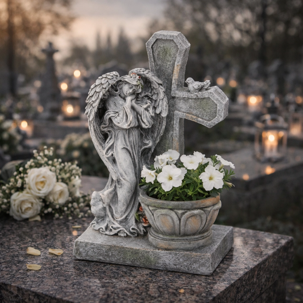 Een elegant beeldje van een engel met kruis en bloempot brengt in elke ruimte spirituele symboliek en eerbied voor de nagedachtenis. Perfect voor zowel de begraafplaats als de tuin, waar het verheven design combineert met de praktische mogelijkheid om bloemen te plaatsen.
