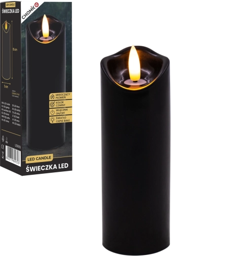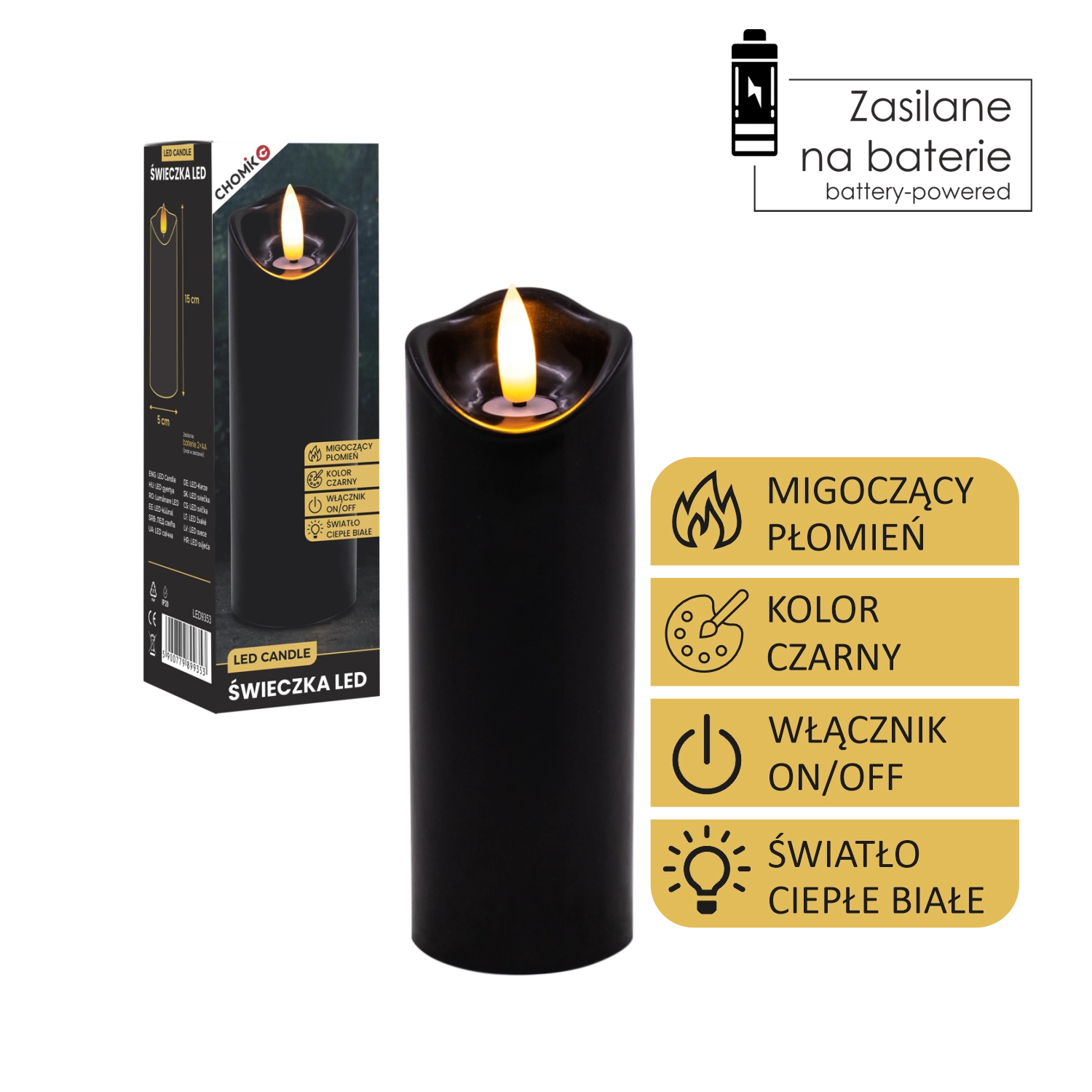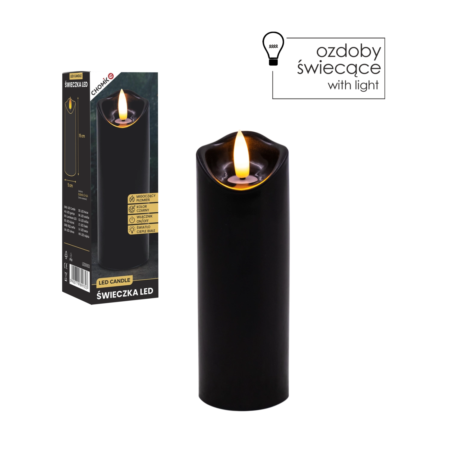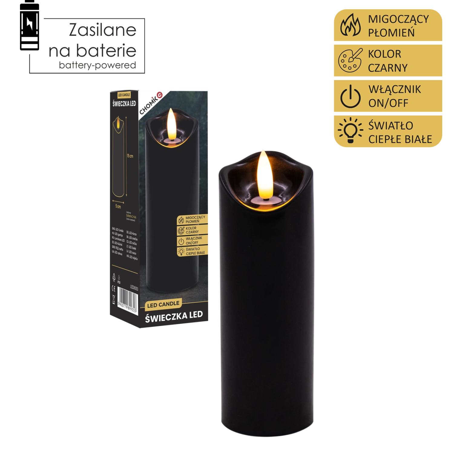 Stijlvolle LED-kaars in zwart met een realistisch, subtiel warm wit flakkerend licht. Perfect als interieurdecoratie en als inzetkaars voor lantaarns of kandelaars. Praktische voeding met 2× AA-batterijen (niet inbegrepen) en eenvoudig On/Off-bediening.