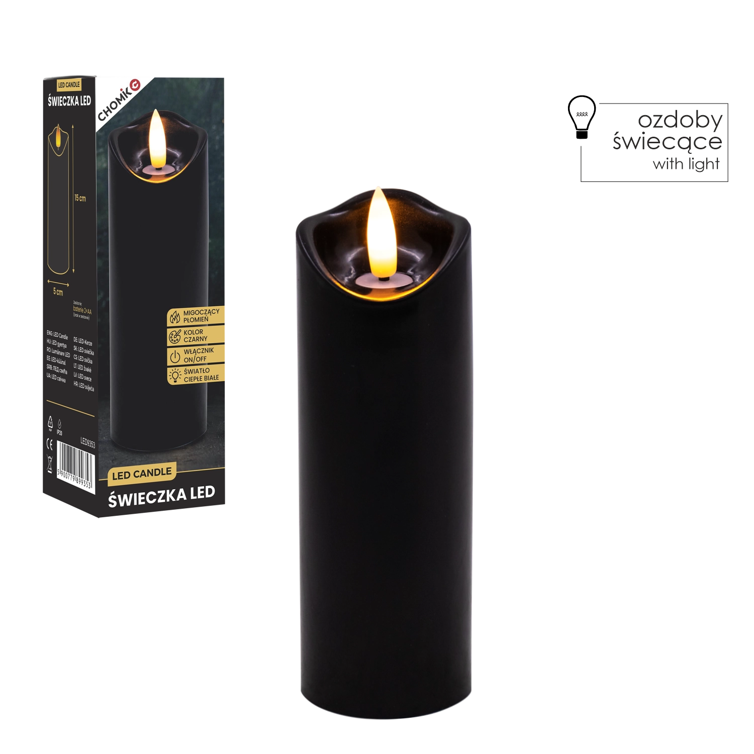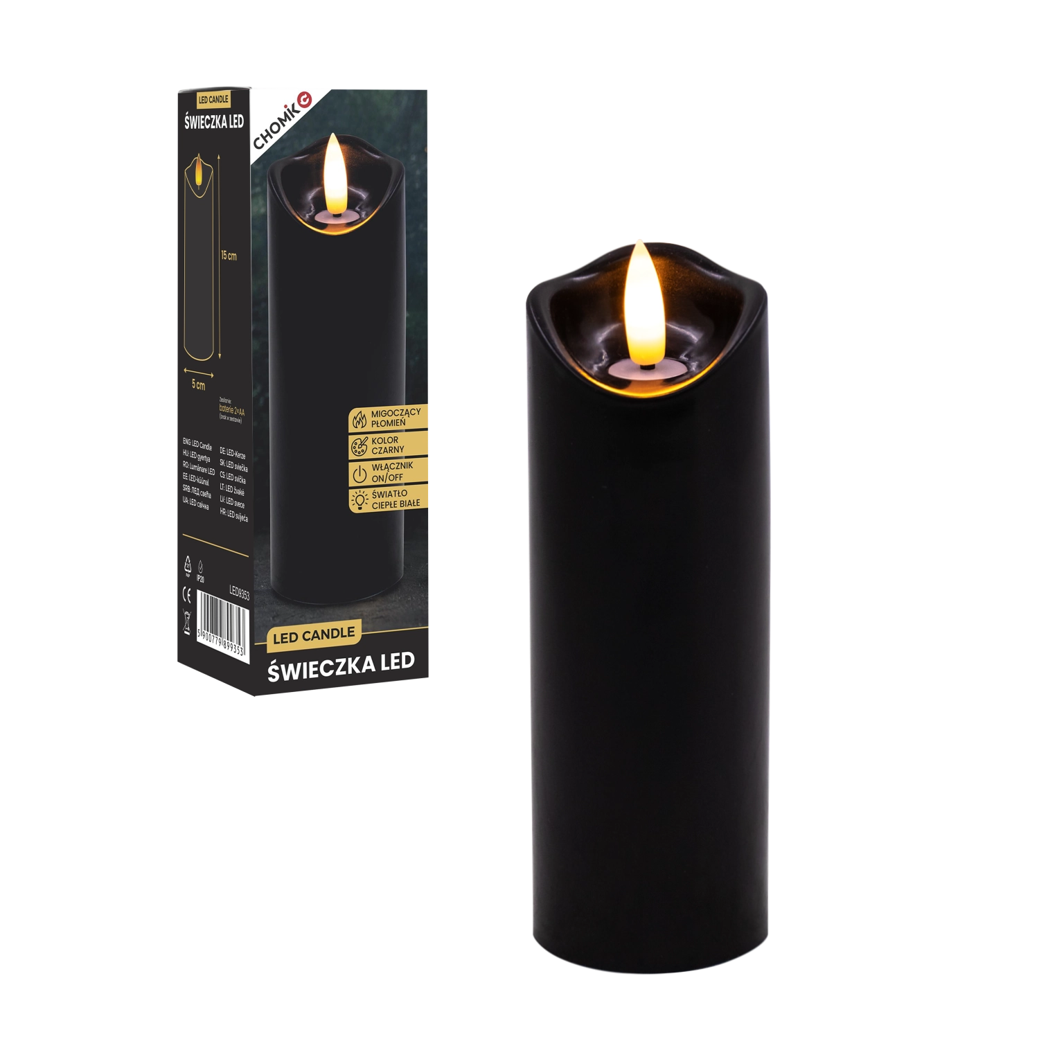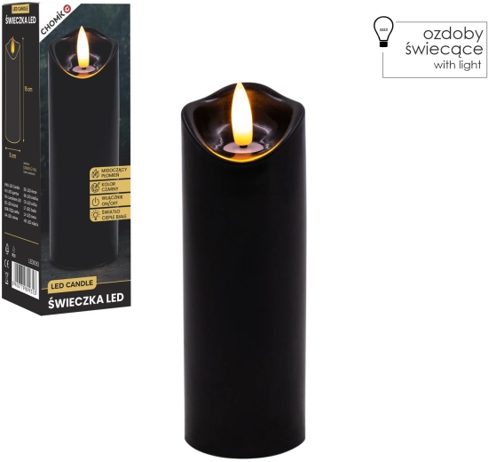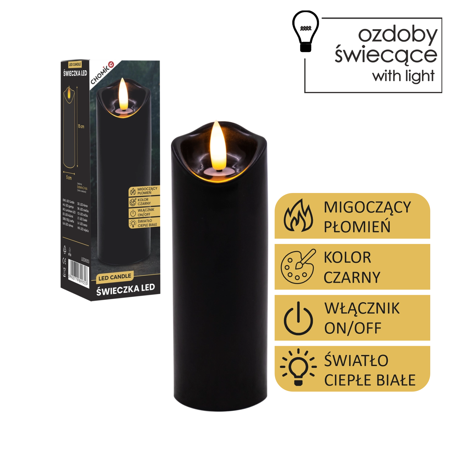 Stijlvolle LED-kaars in zwart met een realistisch, subtiel warm wit flakkerend licht. Perfect als interieurdecoratie en als inzetkaars voor lantaarns of kandelaars. Praktische voeding met 2× AA-batterijen (niet inbegrepen) en eenvoudig On/Off-bediening.