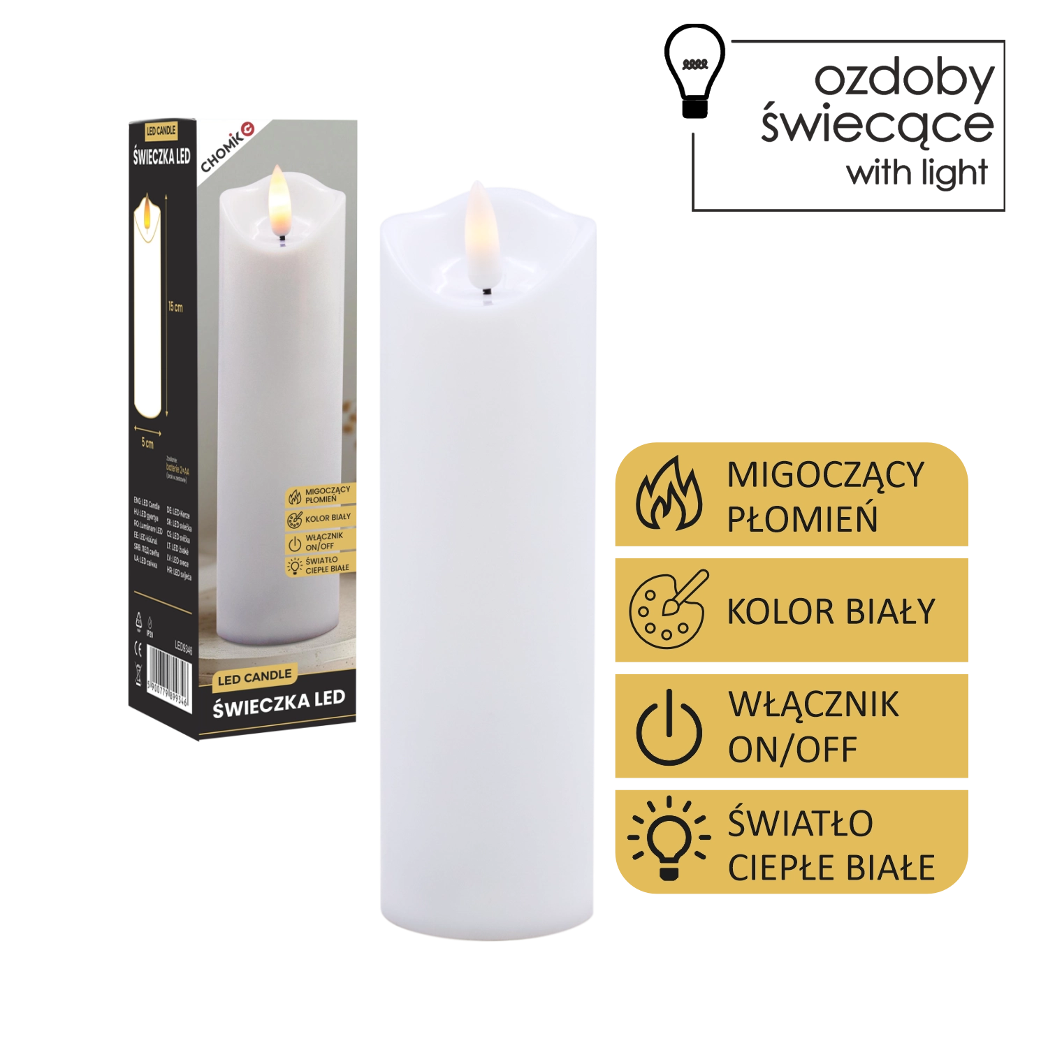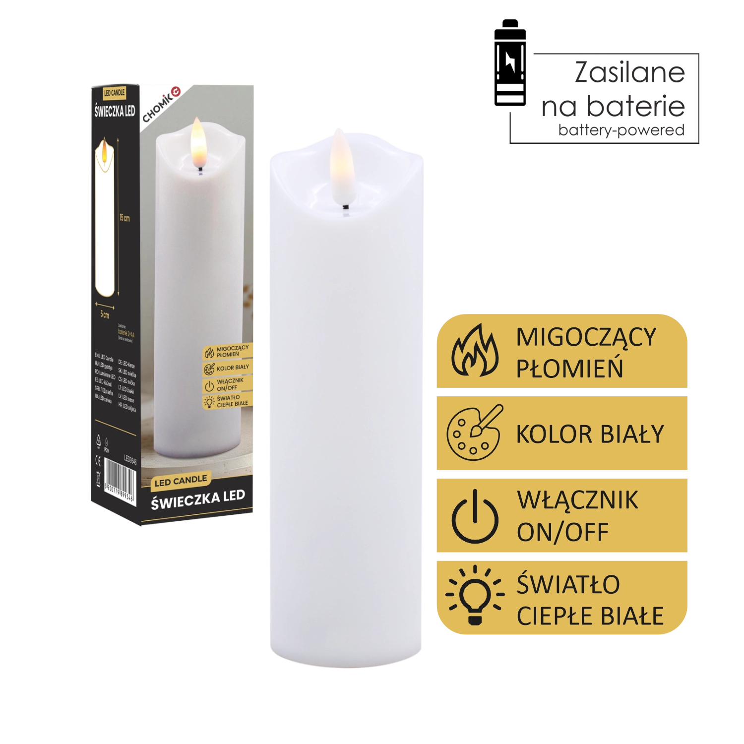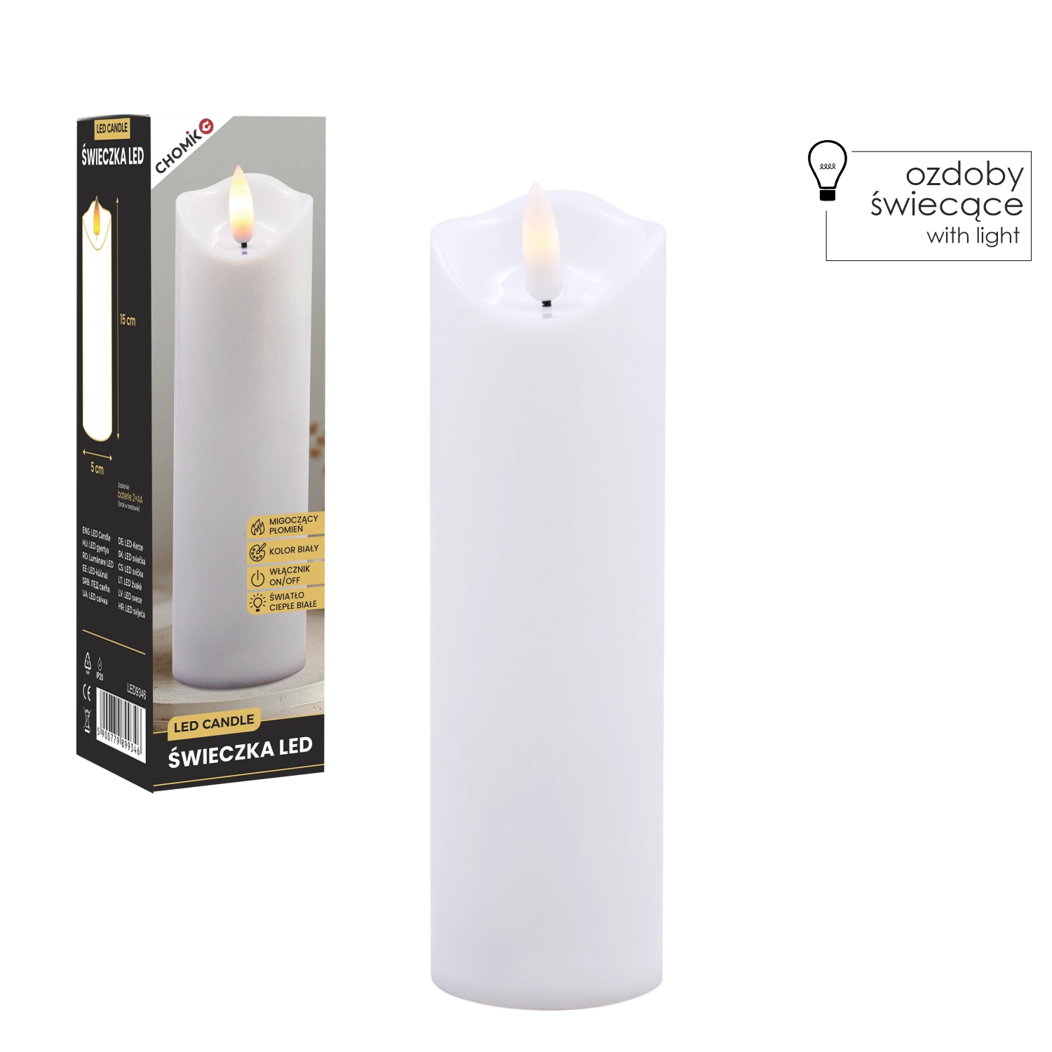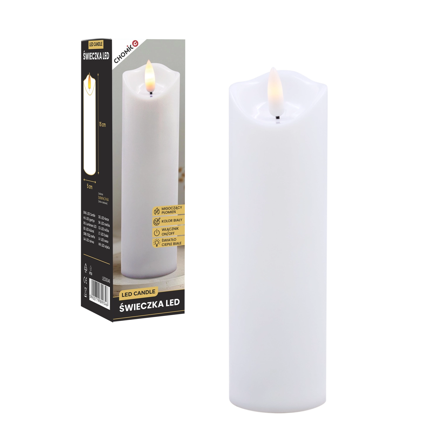 Dankzij de universele afmetingen van 5 × 17,5 cm plaats je haar gemakkelijk in kandelaars, lantaarns of gebruik je haar als inzetstuk in decoratieve vazen en potten. De bediening is uiterst eenvoudig met de On/Off-schakelaar; de voeding verloopt via 2 AA-batterijen (niet inbegrepen), zodat je de kaars overal kunt neerzetten zonder netsnoer.