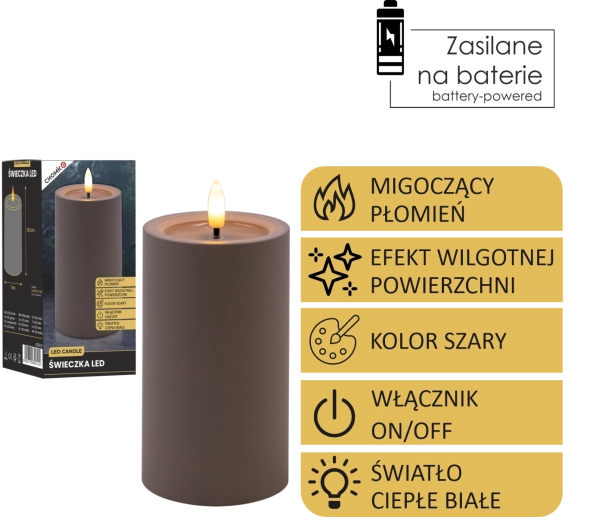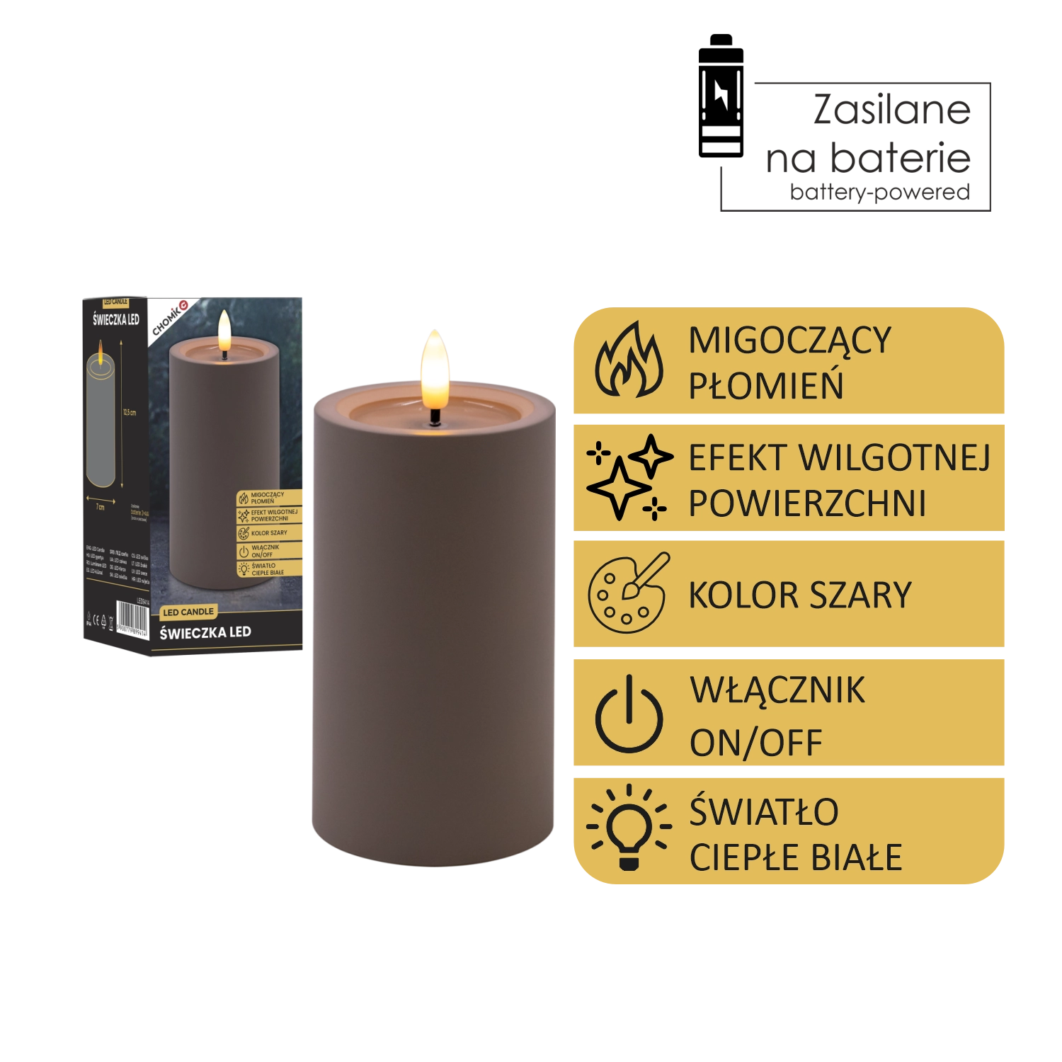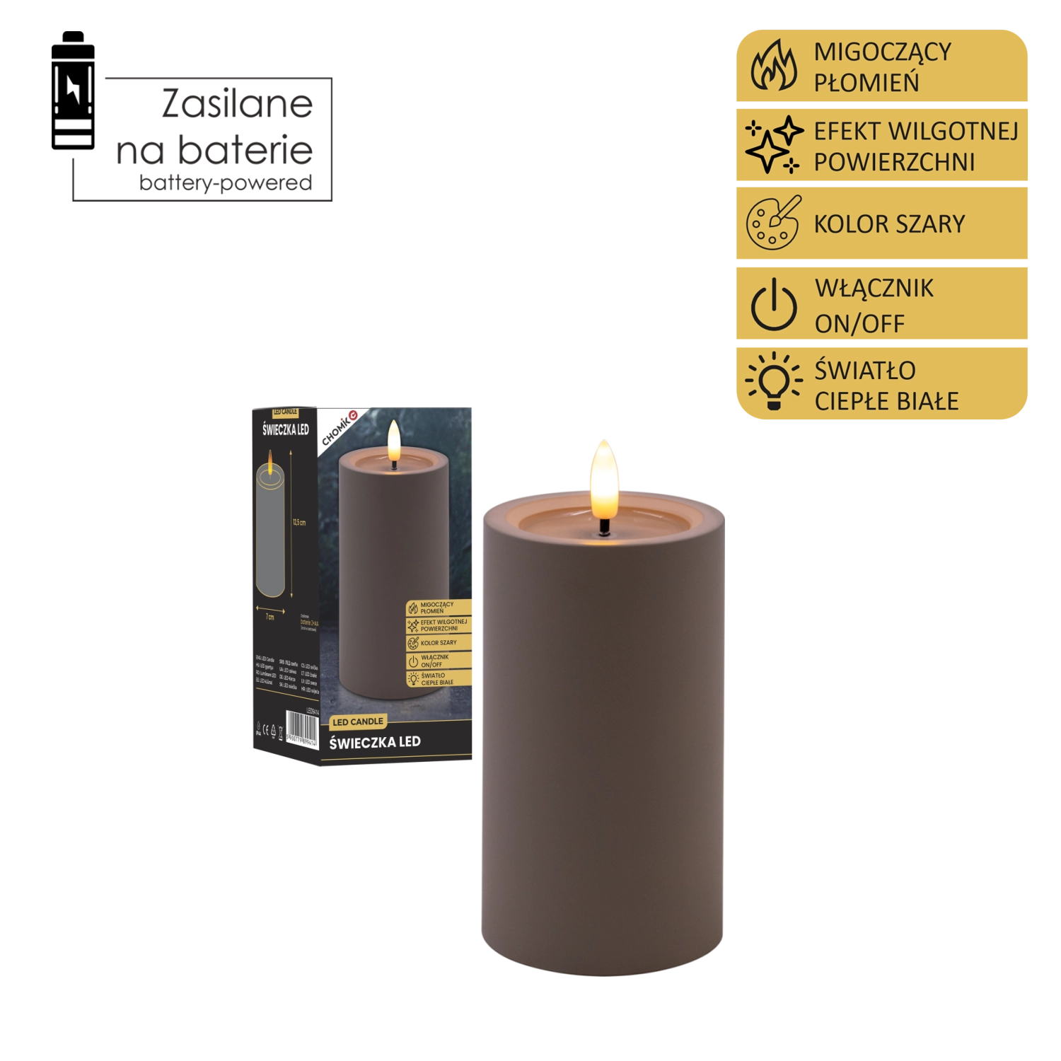 Elegante grijze LED-kaars met een realistische, flikkerende vlam in warm wit en een effect van een vochtige bovenrand voor een natuurlijke uitstraling. Perfect voor binnen, een veilig alternatief voor een klassieke kaars, werkt op 2× AA-batterijen (niet inbegrepen).