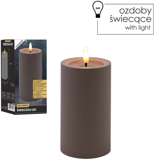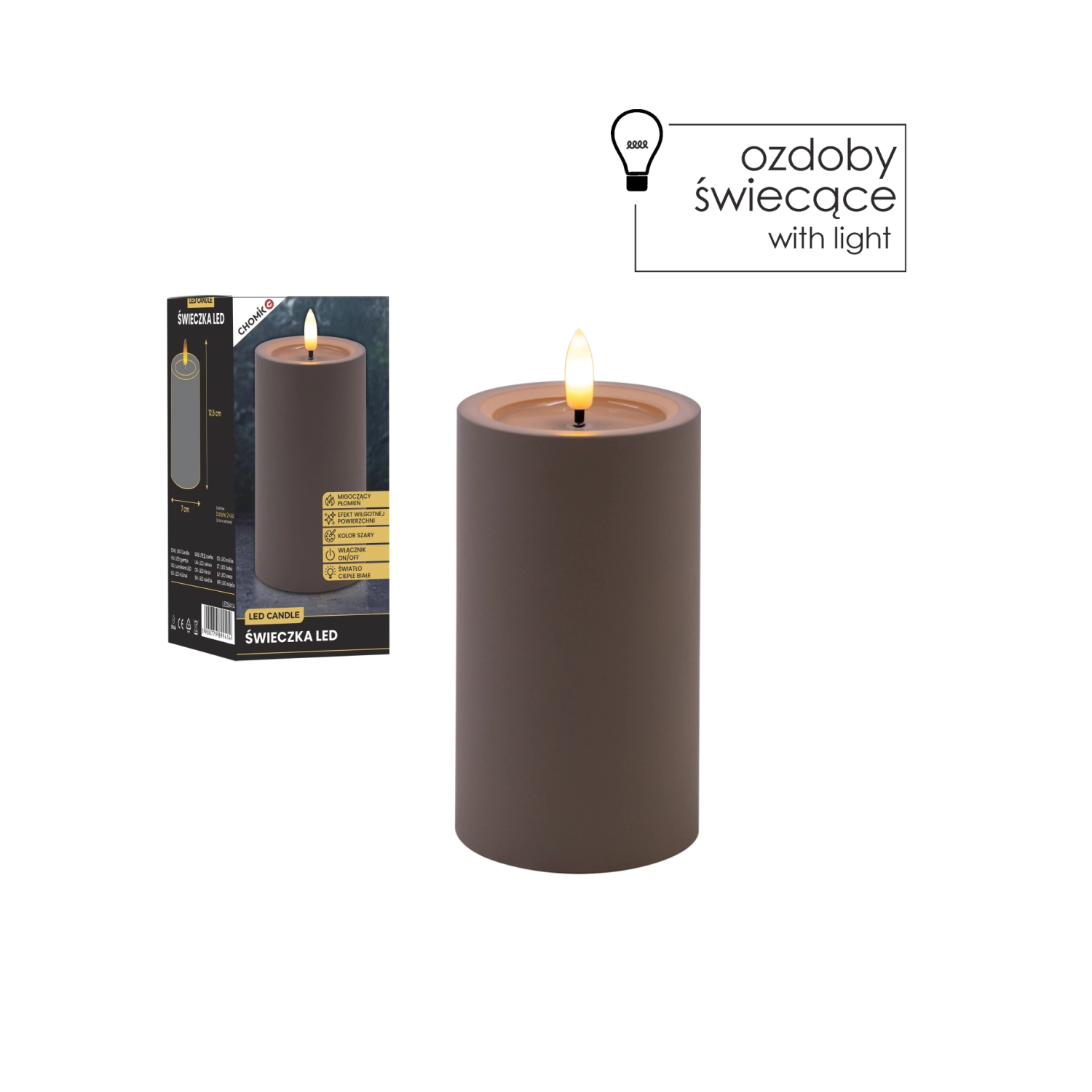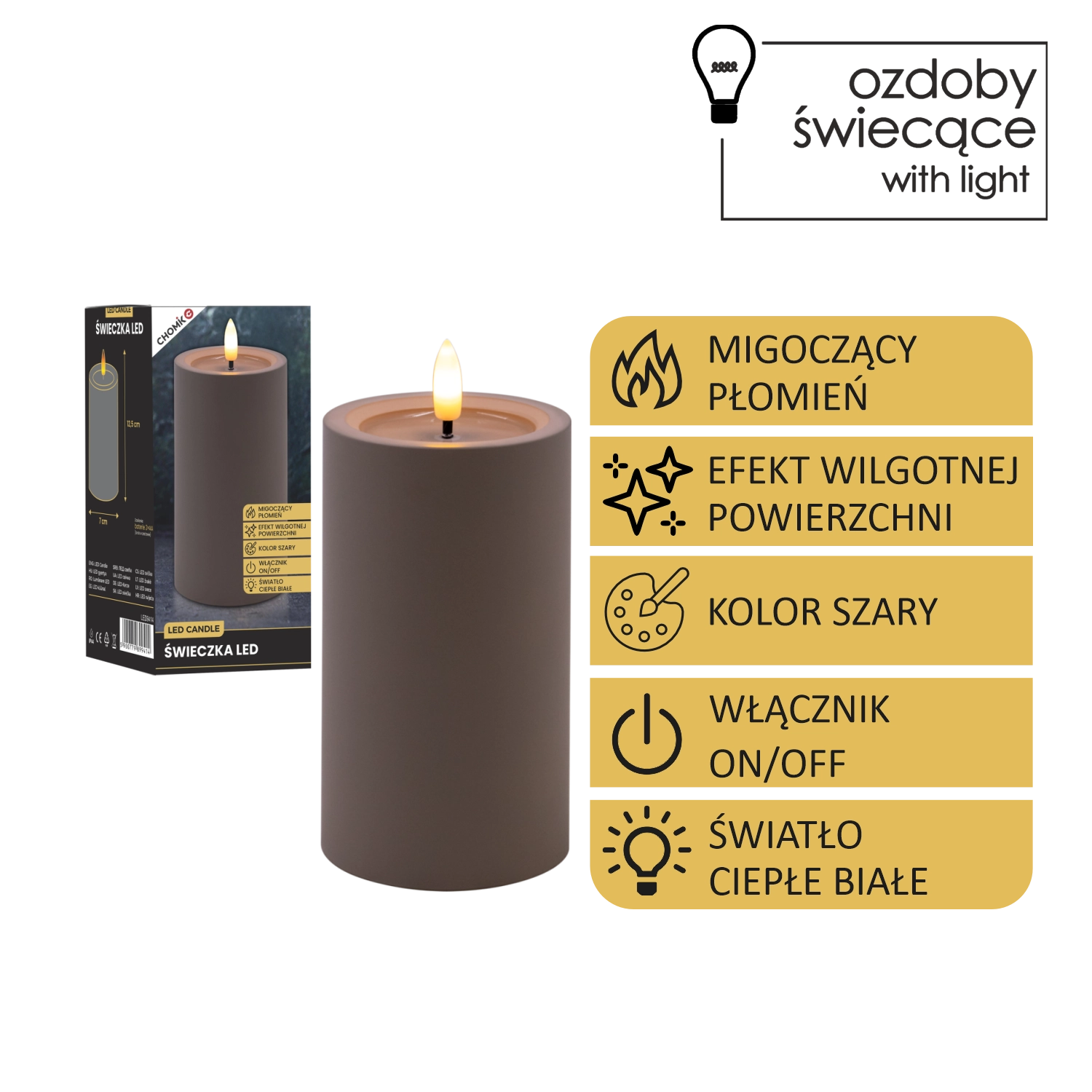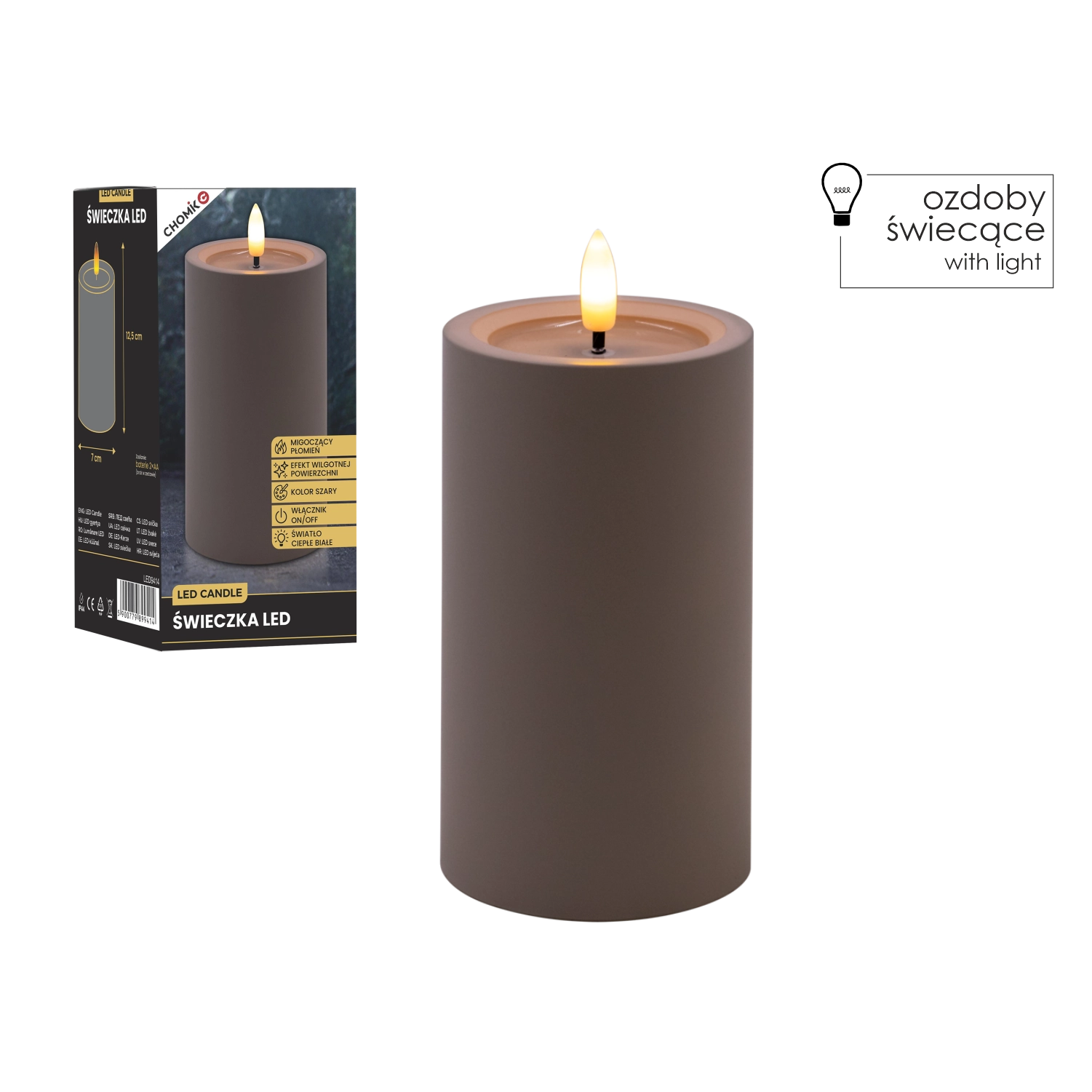 Elegante grijze LED-kaars met een realistische, flikkerende vlam in warm wit en een effect van een vochtige bovenrand voor een natuurlijke uitstraling. Perfect voor binnen, een veilig alternatief voor een klassieke kaars, werkt op 2× AA-batterijen (niet inbegrepen).