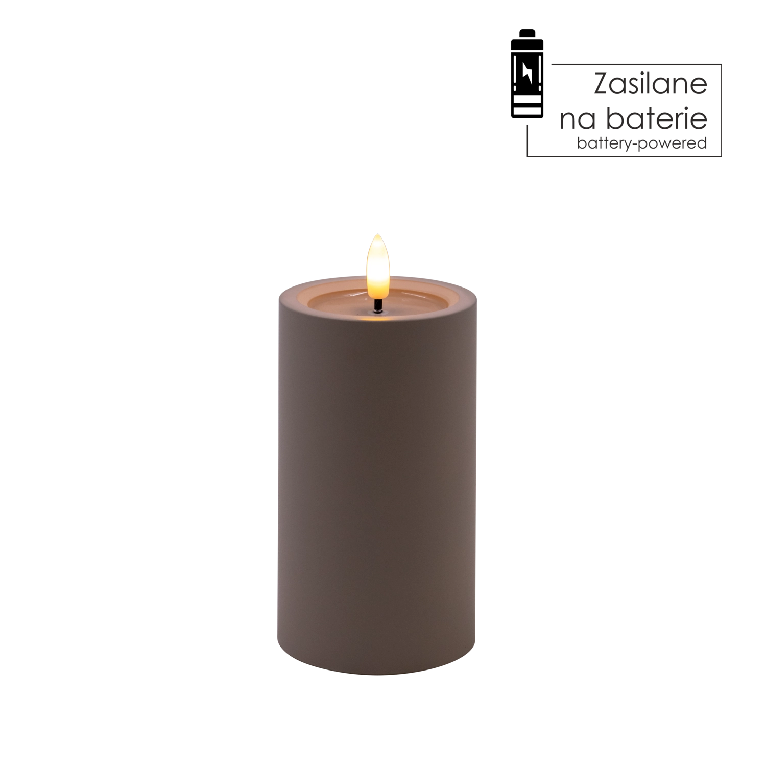 Deze stijlvolle grijze LED-kaars brengt de sfeer van een echte vlam zonder rook of rommel. De realistische warmwitte vlam flikkert subtiel en het effect van een vochtig bovenoppervlak geeft de kaars de authentieke look van gesmolten was. Dankzij de tijdloze kleur is hij eenvoudig te combineren met diverse decoraties en interieurstijlen.