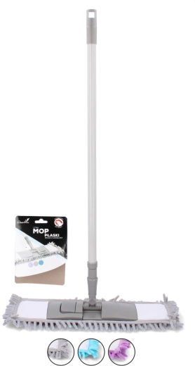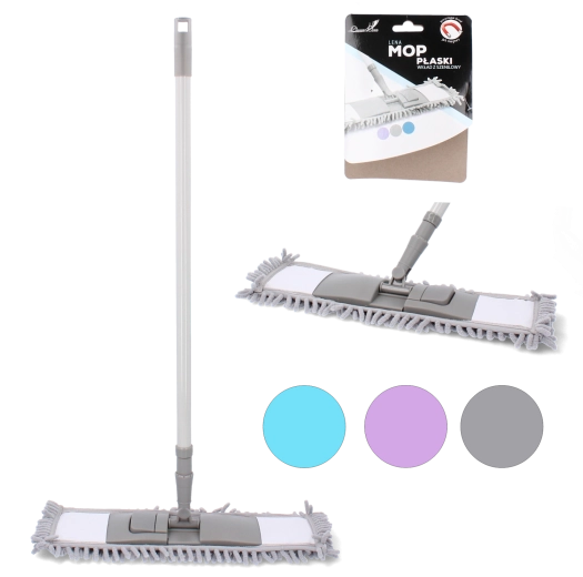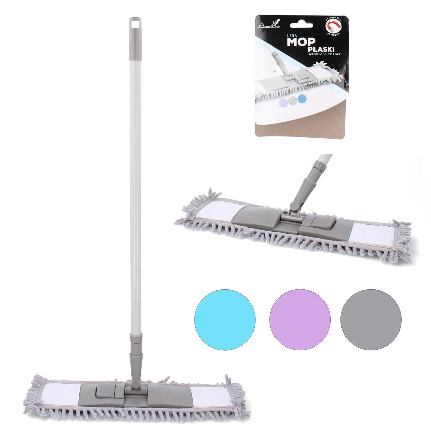 De platte mop met chenillevezel is een praktische hulp voor snel en zacht vloeronderhoud. Dankzij de hoge absorptie en de zachte chenille-franjes vangt hij stof effectief op bij droog wissen en verwijdert hij bij nat reinigen zelfs hardnekkige vlekken zonder chemicaliën. Het dunne platte profiel komt eenvoudig onder meubels en in hoeken, terwijl de telescopische metalen steel 65–116 cm comfortabele lengte-instelling voor iedereen biedt.