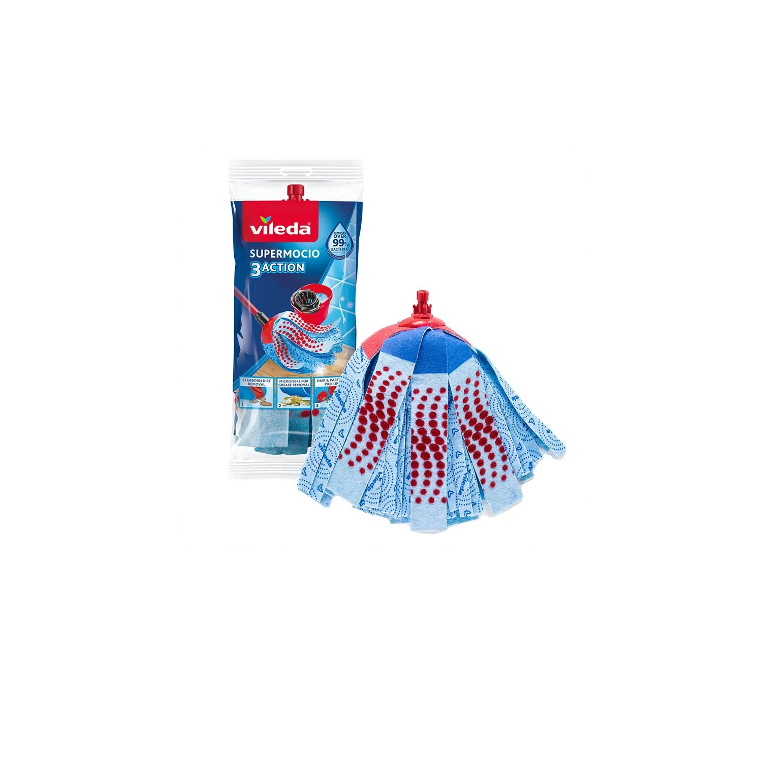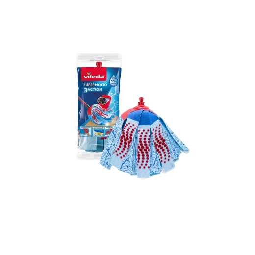 De vervangende mopkop voor de Vileda SuperMocio 3Action Velour combineert drie reinigingszones voor een snelle en grondige schoonmaak. De schurende rode laag pakt aangekoekt vuil aan zonder te krassen, microvezels nemen vet en kleverige verontreinigingen uitstekend op en veloursstroken vangen effectief haren, stof en fijne deeltjes. De citroenvorm maakt het eenvoudiger om hoeken en onder meubels te reinigen, terwijl bredere stroken het contactoppervlak met 25% vergroten voor snellere resultaten.