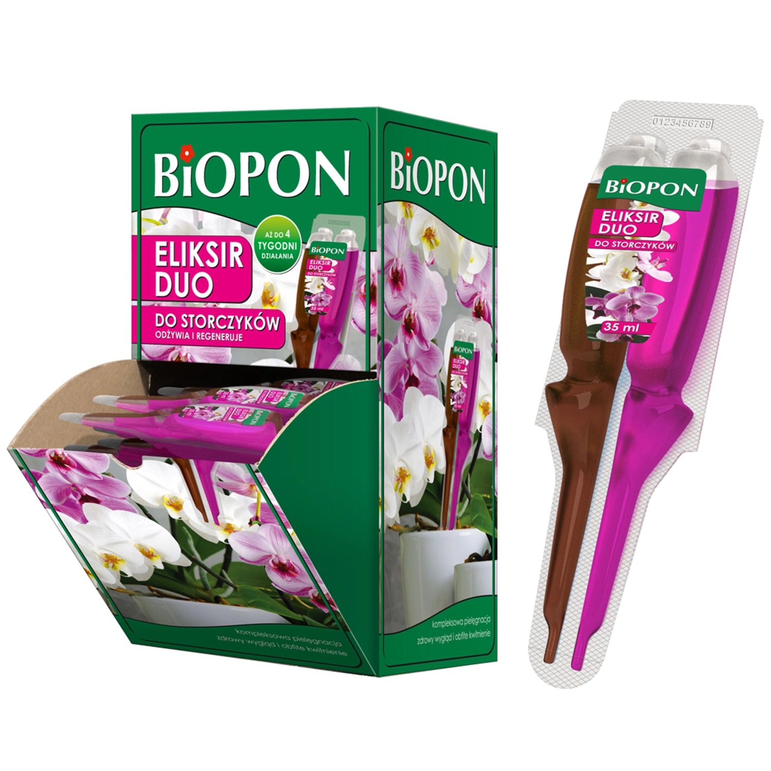 Biopon Eliksir Duo combineert een roze voedende component met essentiële voedingsstoffen voor rijke bloei en gezonde groei en een bruine regenererende oplossing die de wortels versterkt, planten helpt beter om te gaan met stress door verplanten of onjuiste verzorging en hun natuurlijke balans herstelt. Dankzij de gescheiden kamers blijven de actieve stoffen langer effectief en mengen ze pas in het substraat voor maximale opname.