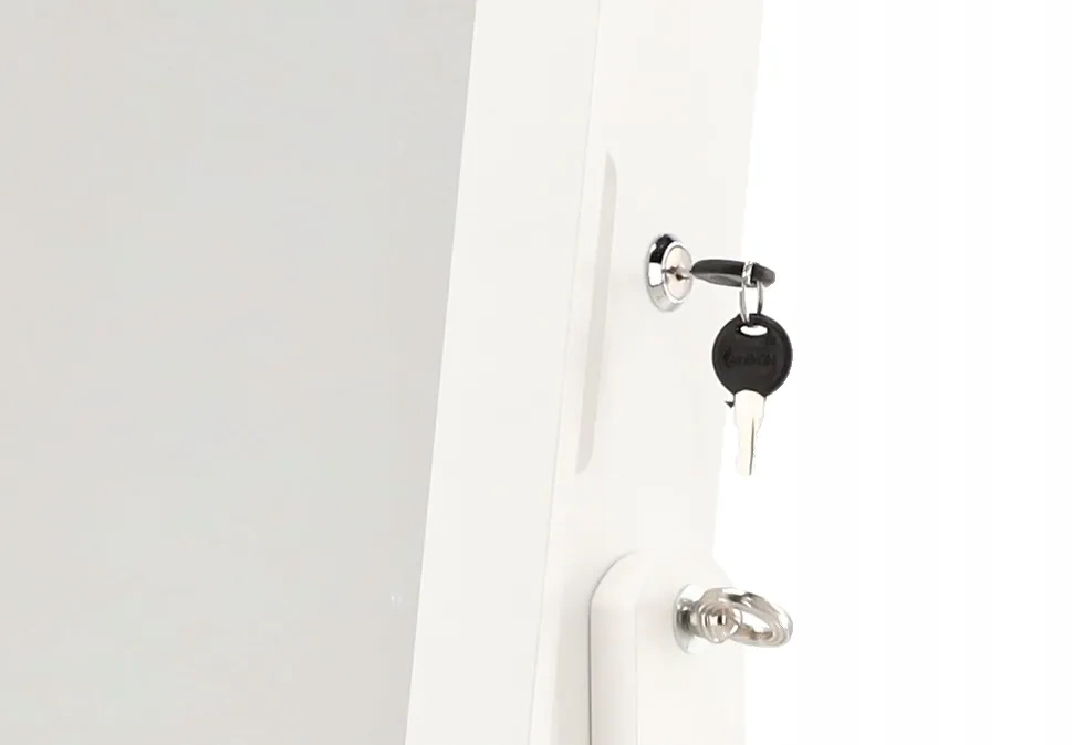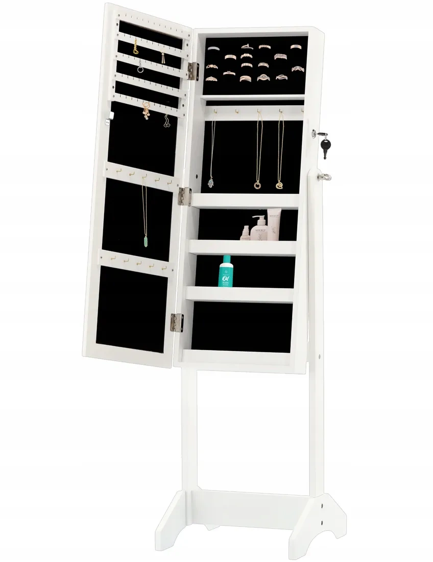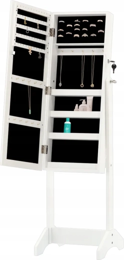 Ontdek een praktische oplossing voor sieraden, cosmetica en accessoires. Deze witte sieradenkast met standaard combineert veiligheid dankzij het slot, overzichtelijke organisatie met haakjes, rijen voor ringen en planken, en een full-size spiegel met verstelbare hoek voor comfortabel passen van outfits.