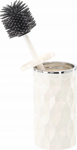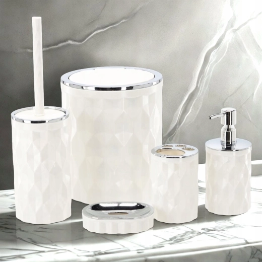 Elk onderdeel heeft doordachte afmetingen voor praktisch gebruik: een compacte prullenbak voor gemakkelijke hantering, een hygiënische toiletborstel met kap, een dispenser met een comfortabele pomp, een organizer voor tandenborstels en tandpasta en een zeepschaaltje dat een stuk zeep netjes op zijn plek houdt.