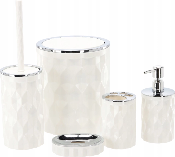 Stijlvolle vijfdelige set badkameraccessoires in elegant wit met alles wat je nodig hebt voor dagelijkse hygiëne en orde. Dankzij het uniforme design met moderne details en de praktische indeling krijg je een strakke, harmonieuze look in de badkamer en is het onderhoud eenvoudig. De set bevat een prullenbak, toiletborstel met houder, zeepdispenser voor vloeibare zeep, tandenborstelhouder en een zeepschaaltje.