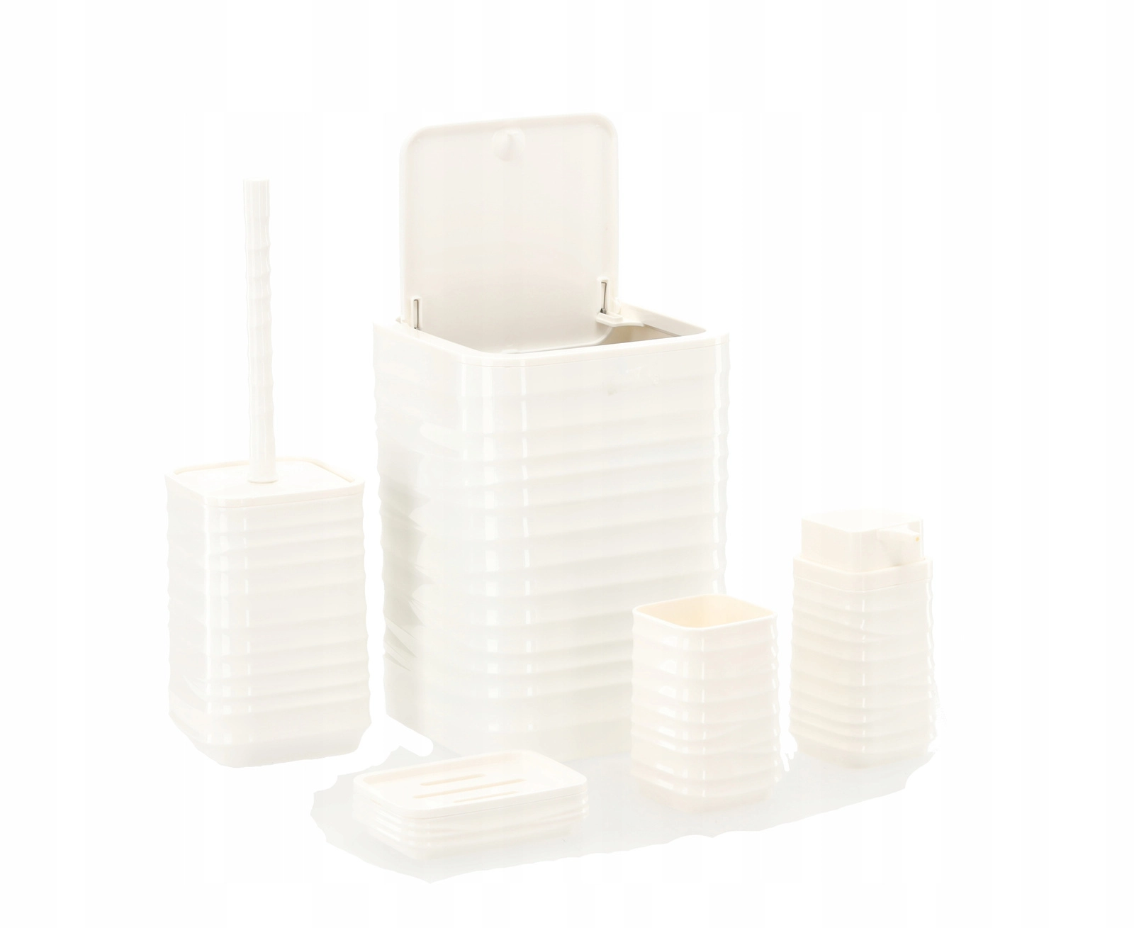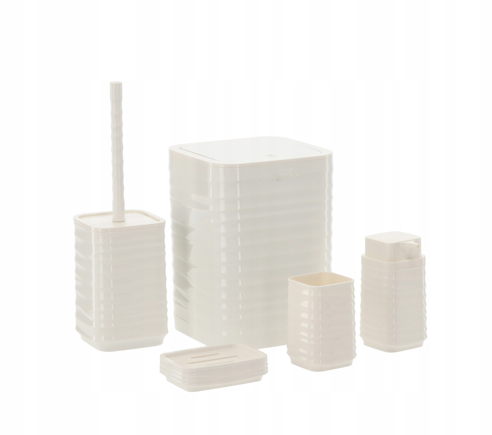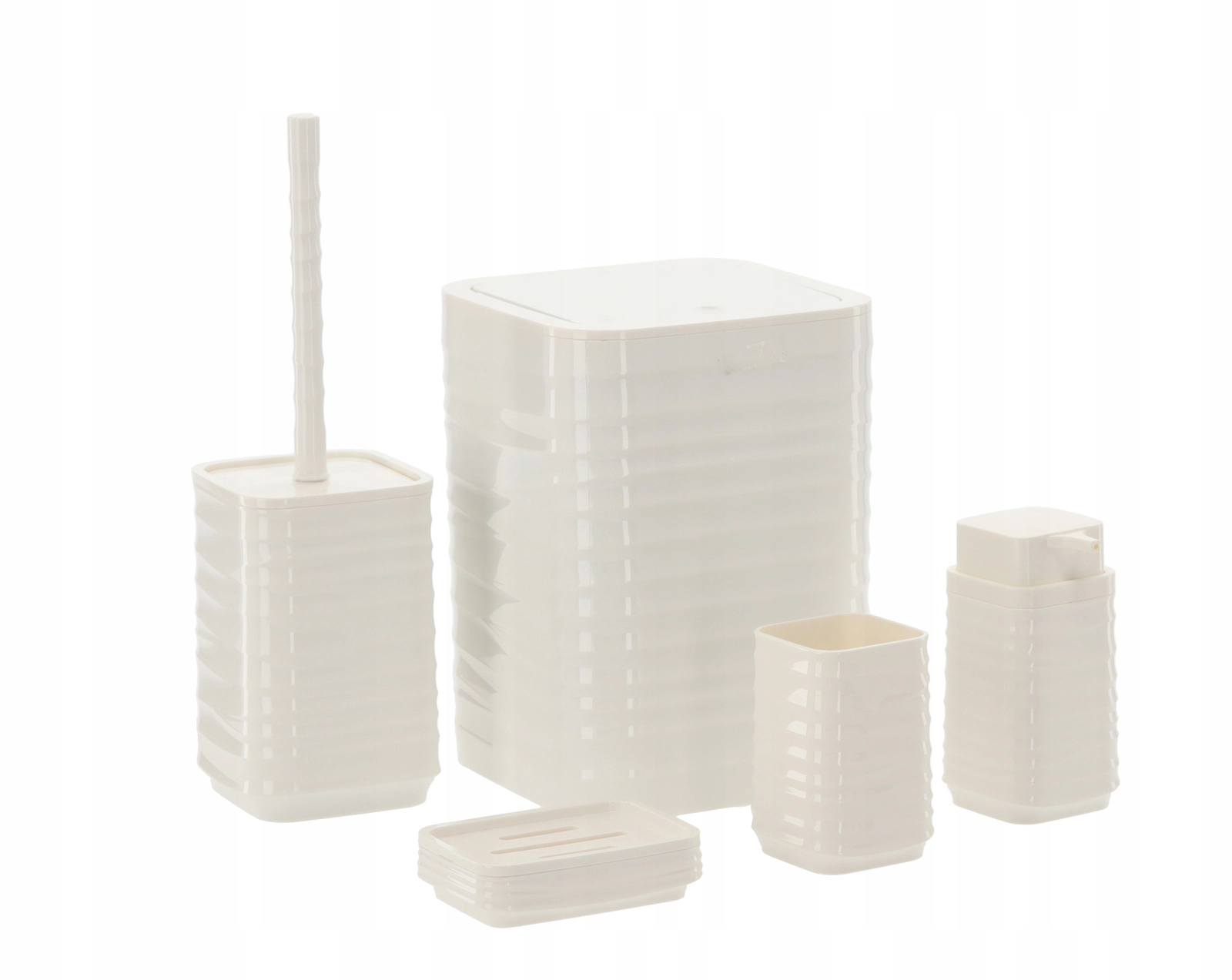 Deze vijfdelige badkamerset in universeel wit biedt een functionele en stijlvolle oplossing voor elk huishouden. Het geribbelde oppervlak en de vierkante lijnen ogen strak en modern, terwijl het duurzame kunststof zorgt voor eenvoudig reinigen en een lange levensduur.