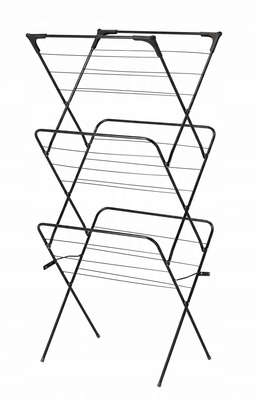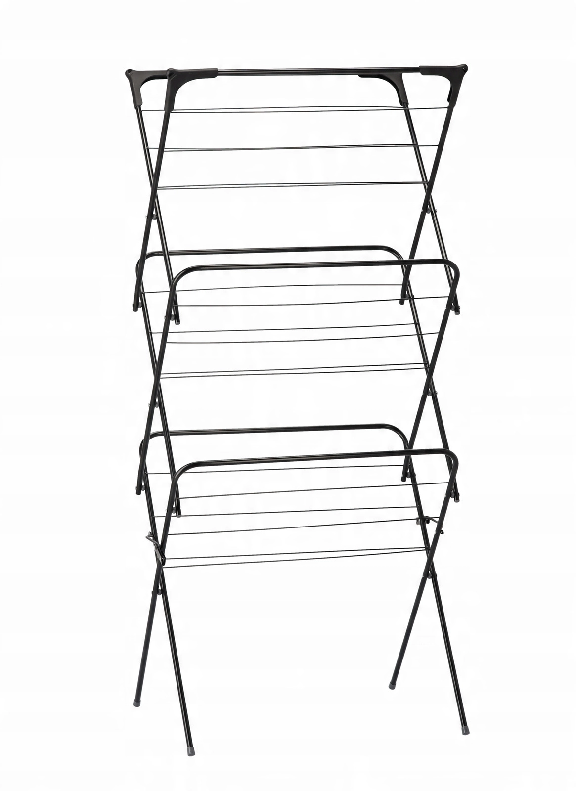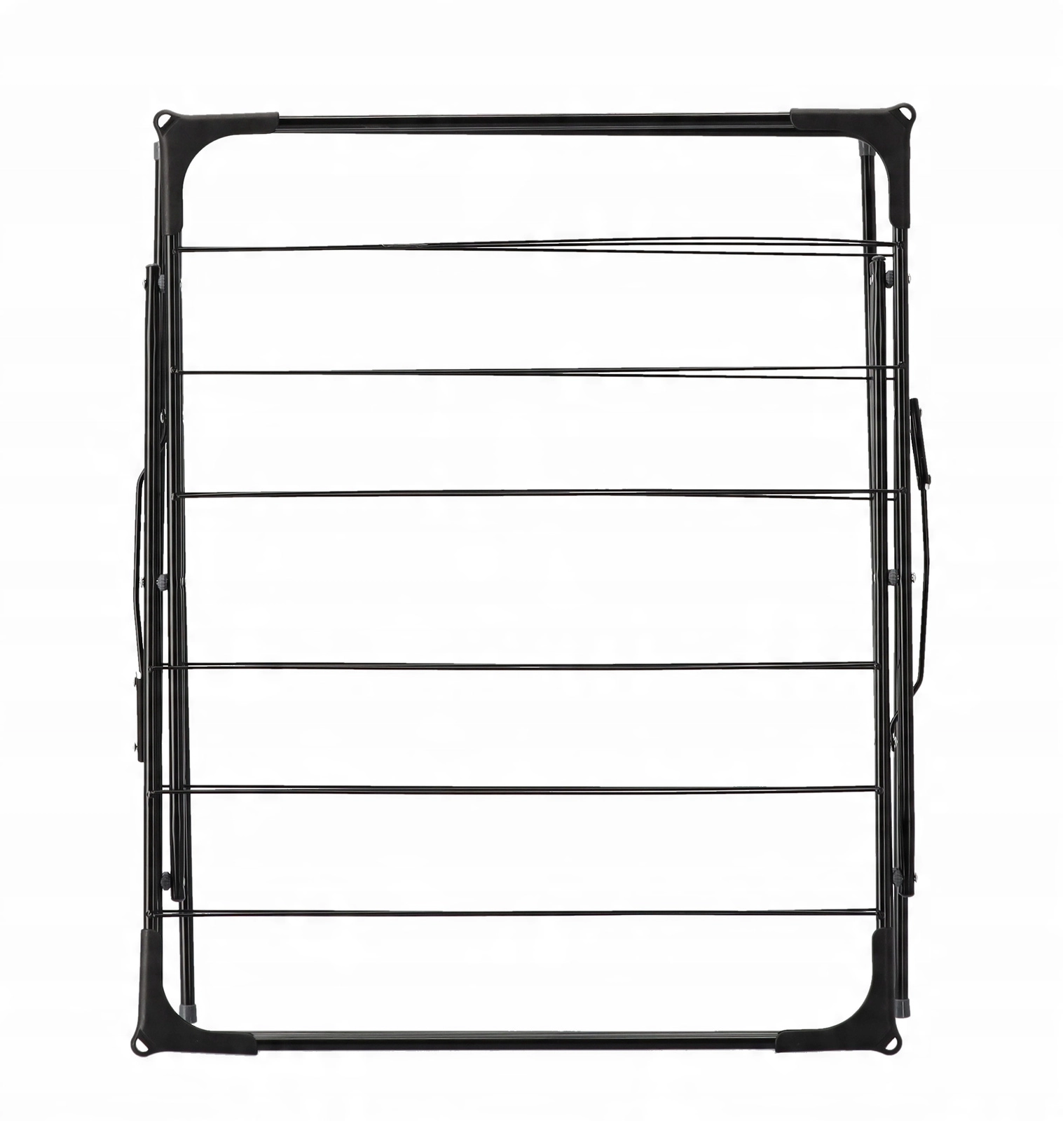 Het stevige metalen frame in het zwart is bestand tegen dagelijks gebruik en weersinvloeden en zorgt voor stabiliteit bij het drogen, zowel binnen als op het balkon.