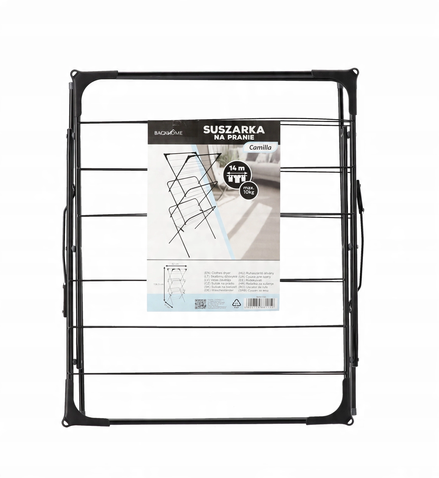Het Camilla droogrek in elegant zwart combineert een duurzame metalen constructie met een praktische indeling met meerdere niveaus. Met een totale drooglengte van 14 meter biedt het comfortabel plaats aan een standaard waslading en bespaart het tegelijk ruimte in huis.