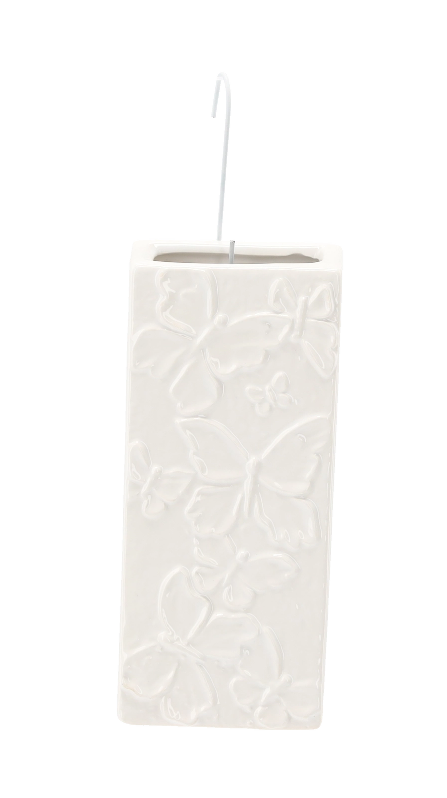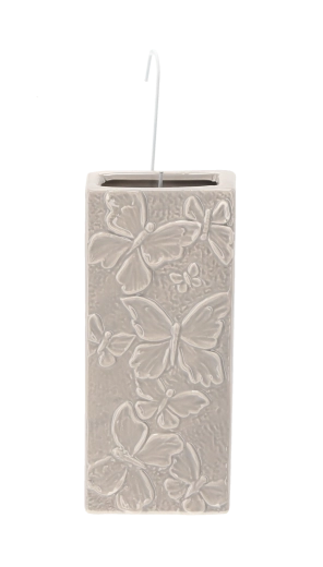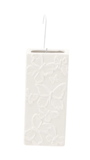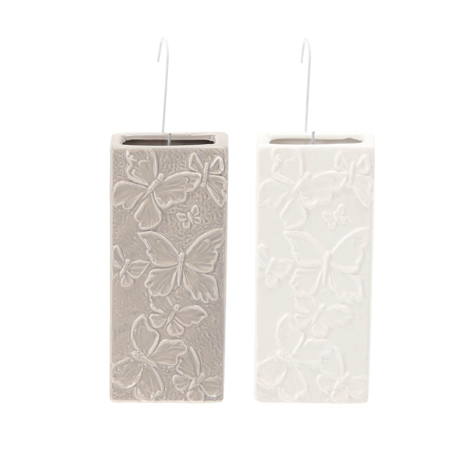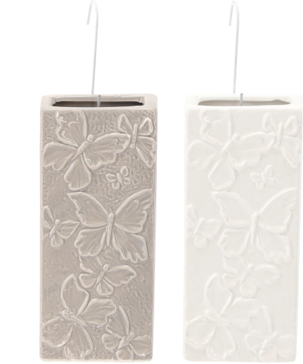 Decoratieve keramische luchtbevochtigers voor op de radiator met reliëf van vlinders verhogen op natuurlijke wijze de luchtvochtigheid in huis, zonder elektriciteit en zonder geluid. In de verpakking zitten 6 stuks in een kleurenmix, elk met een metalen haak om op te hangen en een bovenzijde vulopening. De stijlvolle uitvoering in wit en beige geeft je huis een elegante uitstraling en helpt tegen droge lucht tijdens het stookseizoen.