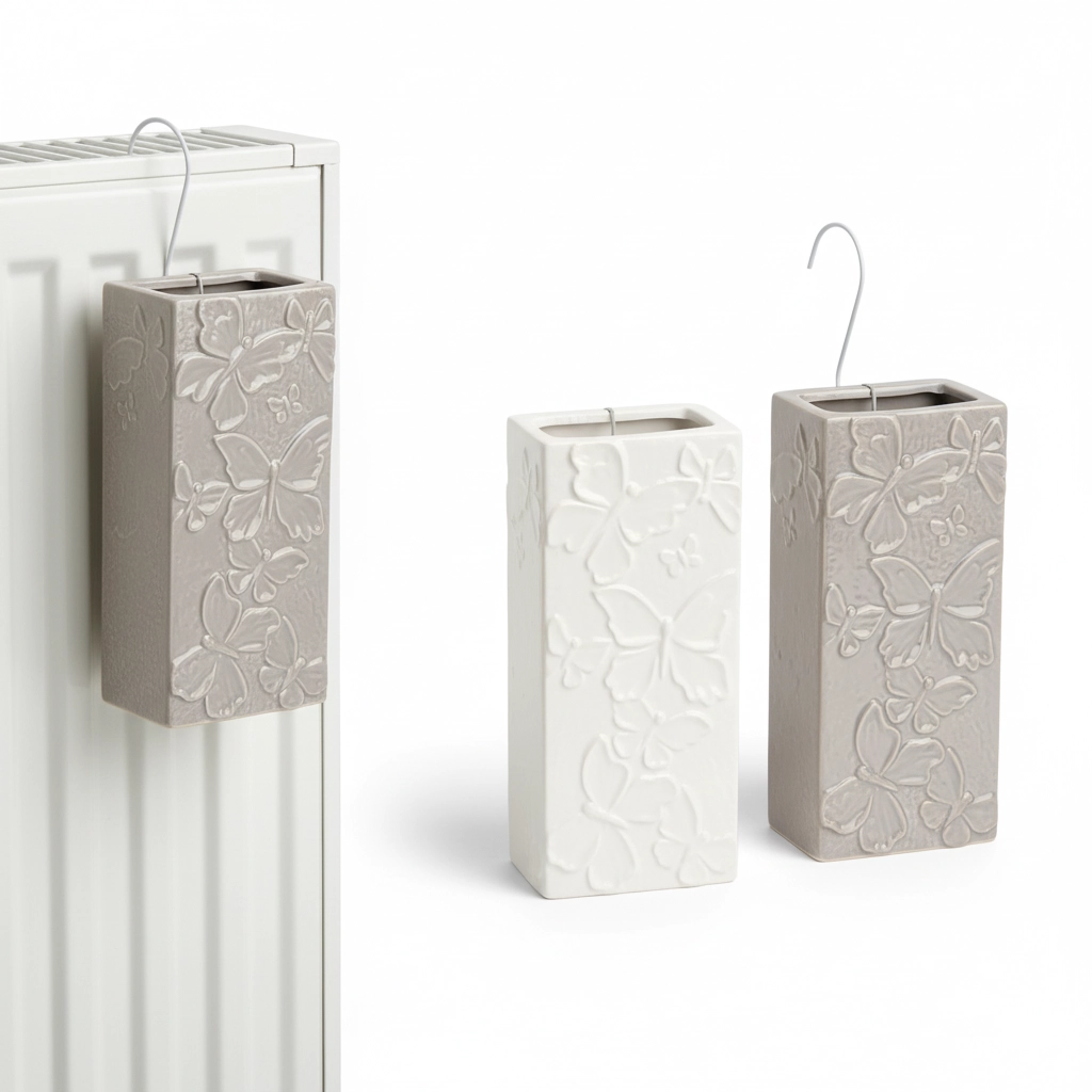 Creëer een aangenaam binnenklimaat met keramische radiator-luchtbevochtigers met een subtiel vlinderreliëf. Vul ze met water en hang ze aan de radiator – de warmte zorgt voor een geleidelijke verdamping en natuurlijke bevochtiging van de lucht zonder stroomverbruik, filters of geluid. De set van 6 stuks is geschikt voor meerdere kamers in huis.