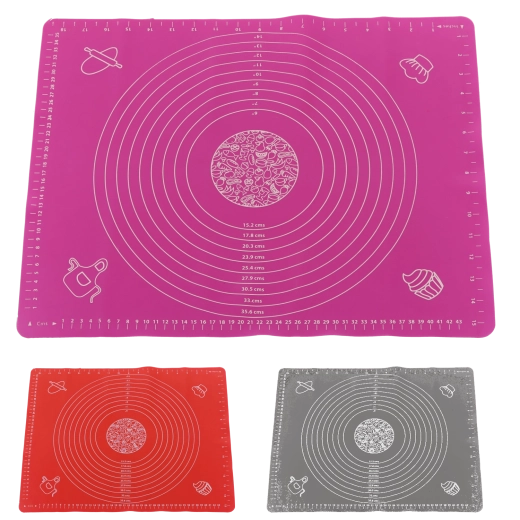 Praktische siliconenmat van 40 × 50 cm voor het bereiden van deeg, marsepein en suikermassa. Dankzij het antiaanbakoppervlak plakt het deeg niet vast, de mat hecht stevig aan het werkblad voor stabiel werken en na gebruik kun je haar eenvoudig oprollen en vastzetten met de clip. Ze is hittebestendig tot +230 °C, veilig voor contact met voedsel en geschikt voor de vaatwasser.