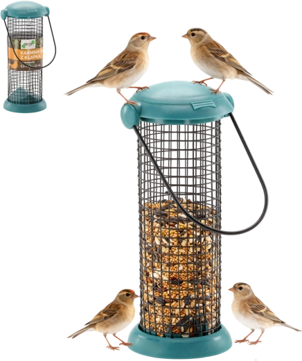 Praktische hangende tube-voeder voor zaden en pinda’s biedt vogels gemakkelijke toegang tot voer en houdt het tegelijk droog. Voorzien van sterk metalen gaas, een duurzame kunststof deksel met klep voor handig bijvullen en een ophangoog voor snelle montage aan een tak of haak.
