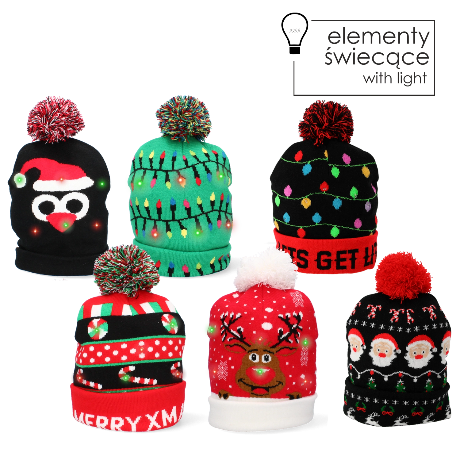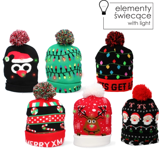 Zoek je een origineel accessoire voor een bedrijfsfeest, familiefoto’s of kerstmarkten? De mix van designs in deze set maakt iedereen blij – van mutsen met opschriften zoals MERRY XMAS, via motieven met rendieren, Kerstman en lichtslingers, tot modellen met LED-verlichting voor een echt “wow”-effect. Alle mutsen zijn van zachte tricot, warm en prettig om te dragen.