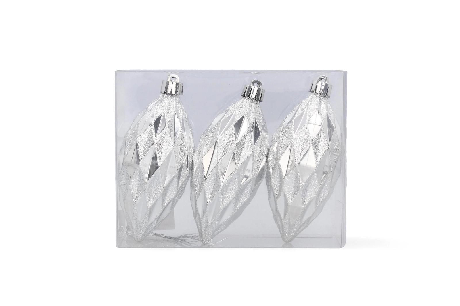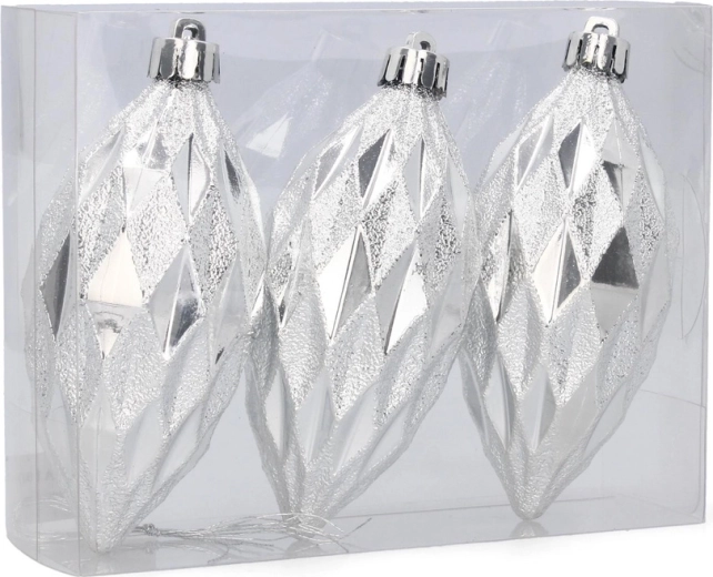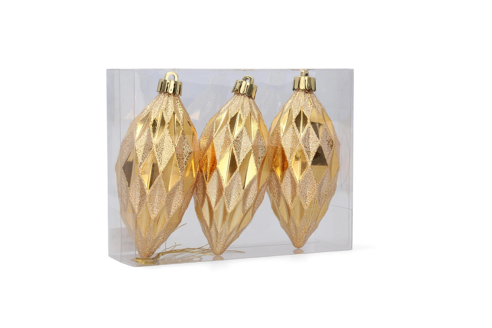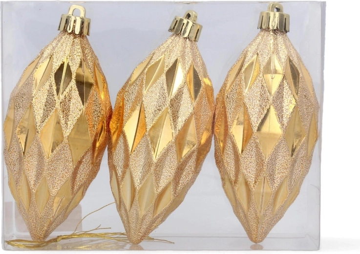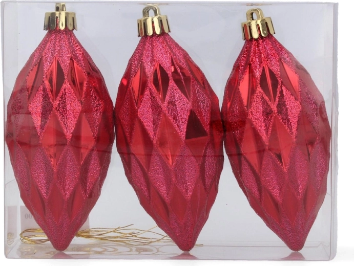 Creëer thuis de sfeer van traditionele kerstdagen met een set van drie langwerpige ornamenten in de favoriete kleuren – rood, goud en zilver. Het glanzende oppervlak geeft de decoratie een unieke schittering en accentueert de lichtreflecties in je kerstboom.